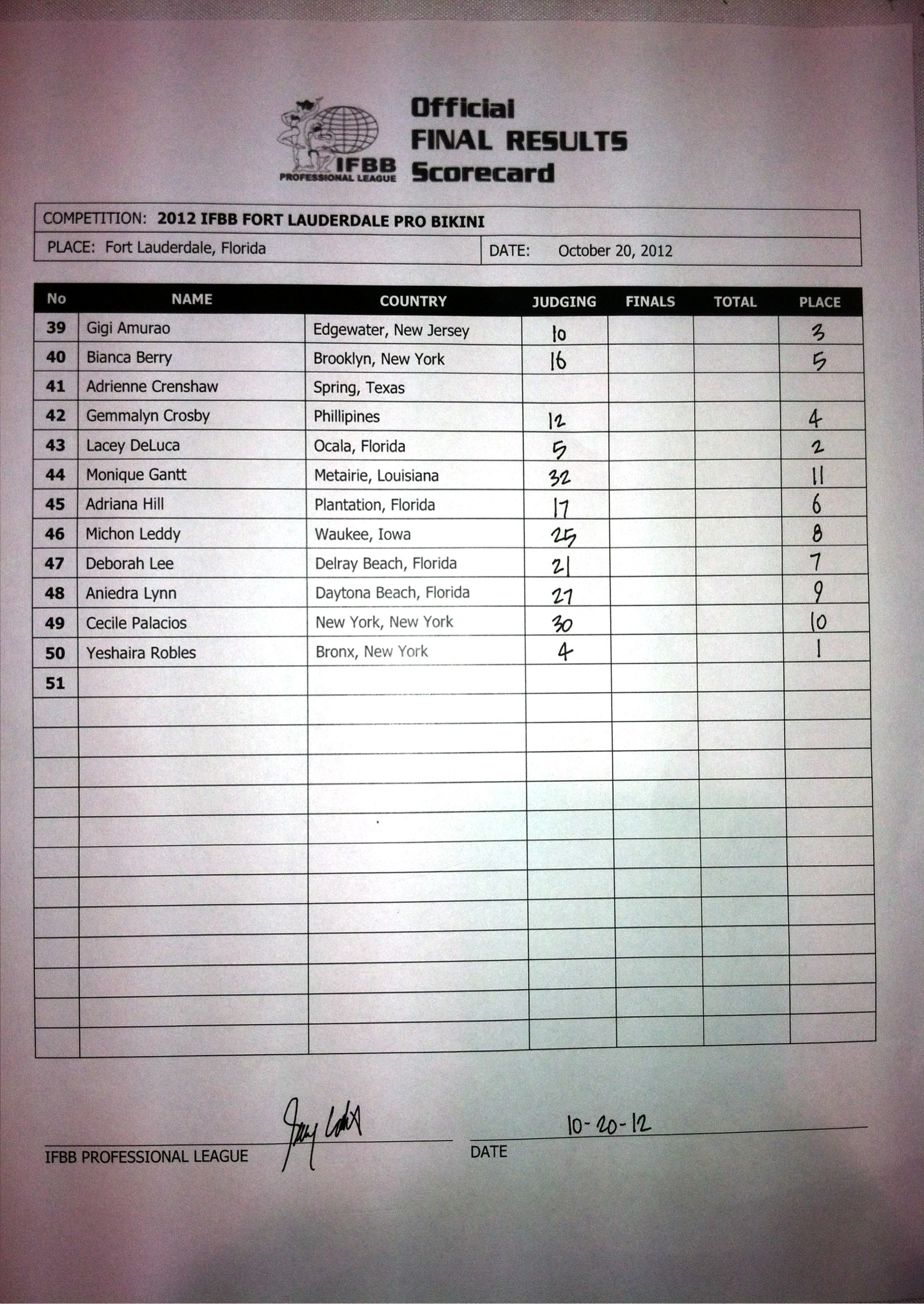 Lacey DeLuca, competing in only her second pro contest, finished second to Robles once again. DeLuca placed second at the Valenti Cup in early September. Gigi Amurao rounded out the top three.