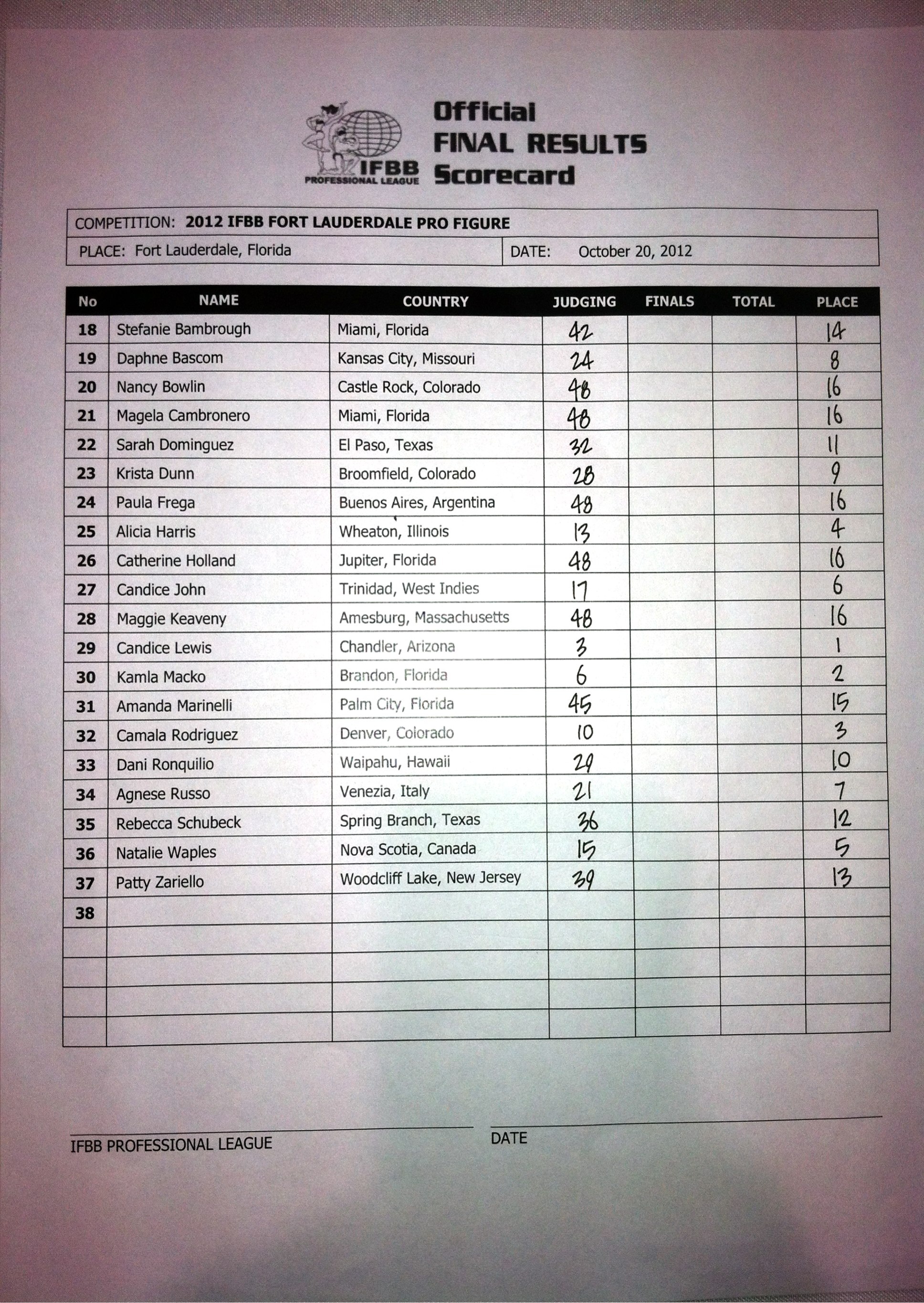 Rookie Kamla Macko finished as the runner-up for the second straight contest – Macko placed second at the Valenti Cup in her pro debut – while Camala Rodriguez placed third in her figure debut. Rodriguez had previously competed in the Fitness division before deciding to make the switch to figure.