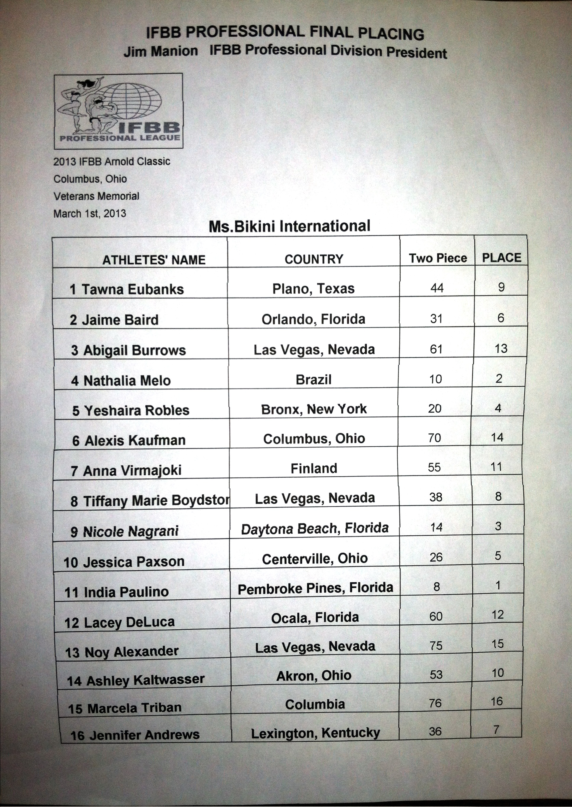 India Paulino had the best night of her young career, coming out on top in the latest three-woman race at the top of the division to win the Bikini International. Paulino edged past reigning Bikini Olympia winner Nathalia Melo and 2011 Bikini International/Bikini Olympia winner Nicole Nagrani. Only two points separated Paulino and runner-up Melo on the final scoresheets, while Melo and third-place Nagrani were four points apart.