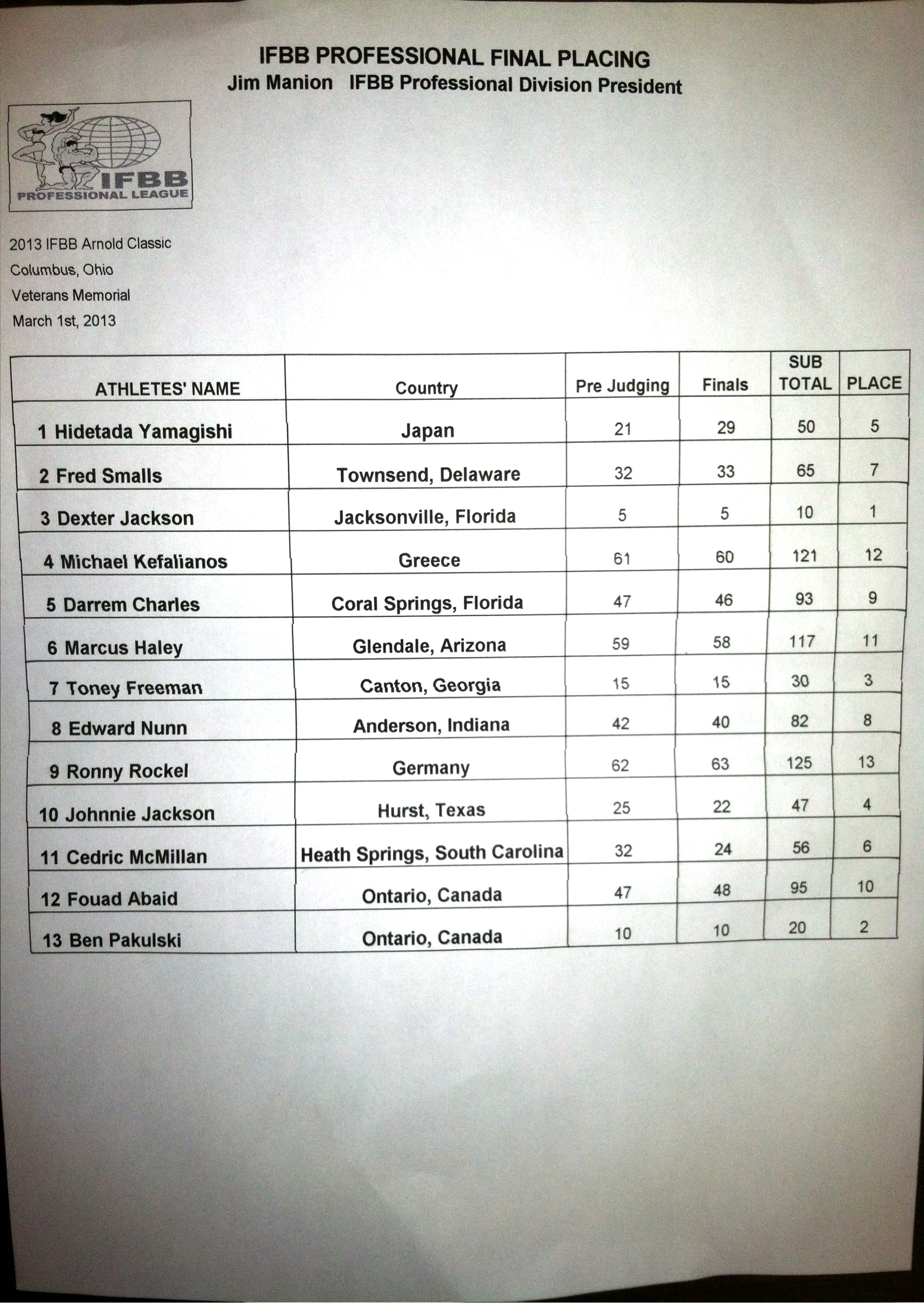 Johnnie Jackson, Hidetada Yamagishi and Cedric McMillan rounded out the top six.