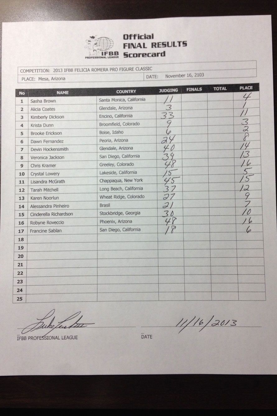 2013 IFBB Felicia Romero Pro Official Results November 16, 2013Articles SHARE Facebook Twitter Pinterest NPC NEWS ONLINE – Breaking News: Official Scorecard for the IFBB Felicia Romero Pro Figure Classic