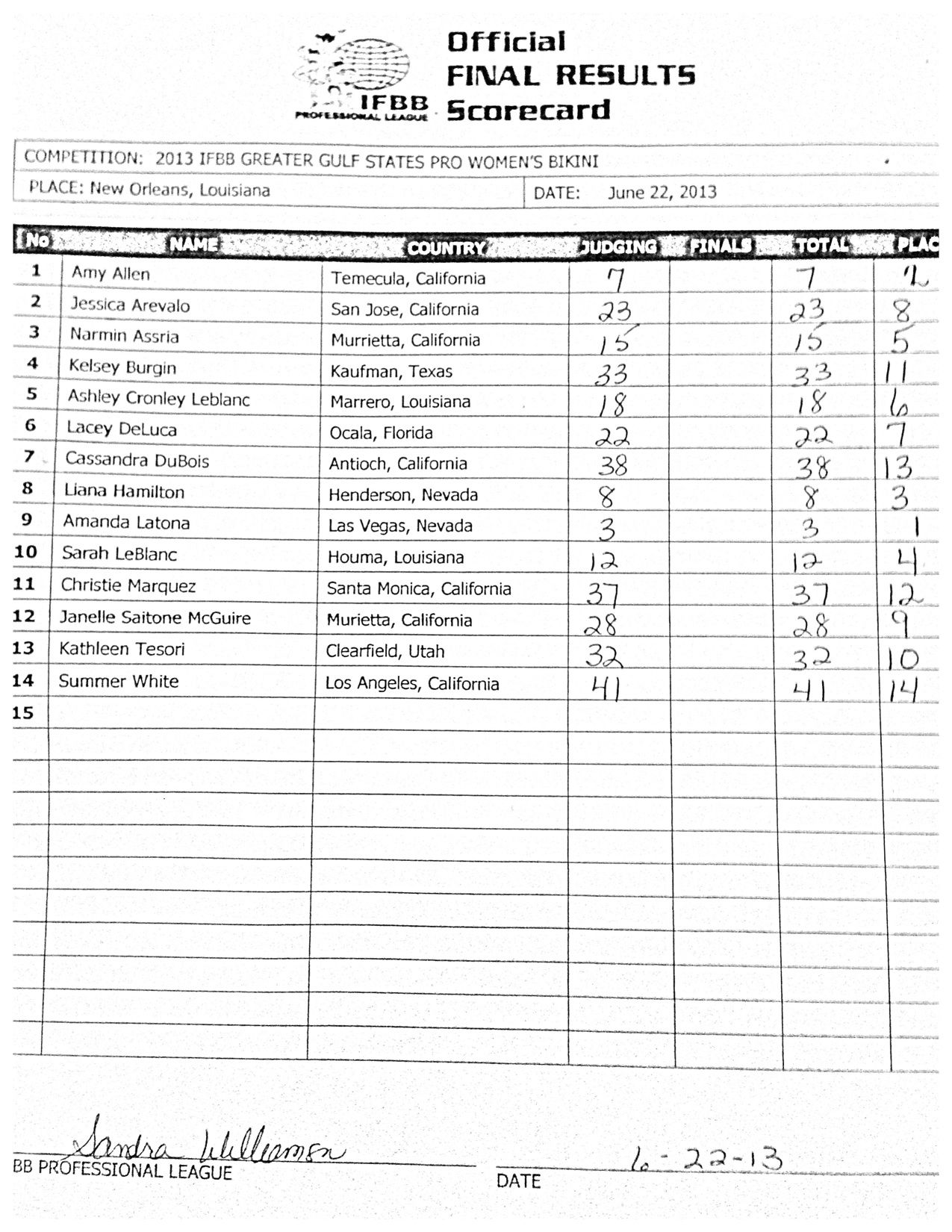 Latona, making her 2013 competitive debut, picked up where she left off in 2012, when she ended the season with a win at the Sacramento Pro. The win was the eighth of Latona’s career, who now has won at least one IFBB contest in each of her four years as a pro. Latona’s best year came in 2011, when she took home top honors from the Sacramento Pro, Titans Grand Prix and the MuscleContest Pro Championships. The win was the 10th of her career, giving her the most wins in the history of the Bikini division.
