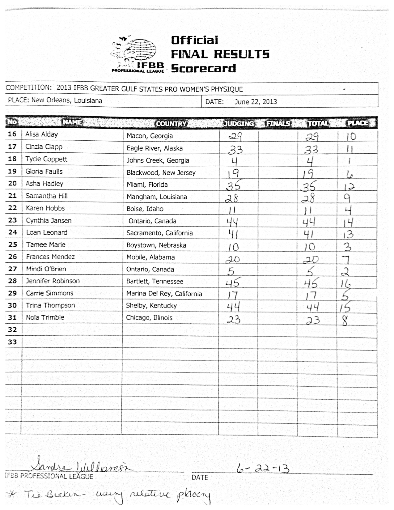 1st Tycie Coppett “Great lines. Small waist, great taper. Beautiful conditioning. Could use a little bit more muscle in her legs. Nice back detail – to me that’s where she beat out everybody else. She had really nice separation without being too lean.”