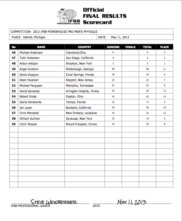 In Men’s Physique, Anton Antipov won for the first time in four professional contests. Antipov, who won the Overall at the 2012 IFBB North Americans, had placed 6th (Pittsburgh Pro), 4th (Europa Show of Champions) and 6th (Houston Pro) in three previous IFBB Pro contests. Michael Anderson and Tyler Anderson placed second and third, respectively.
