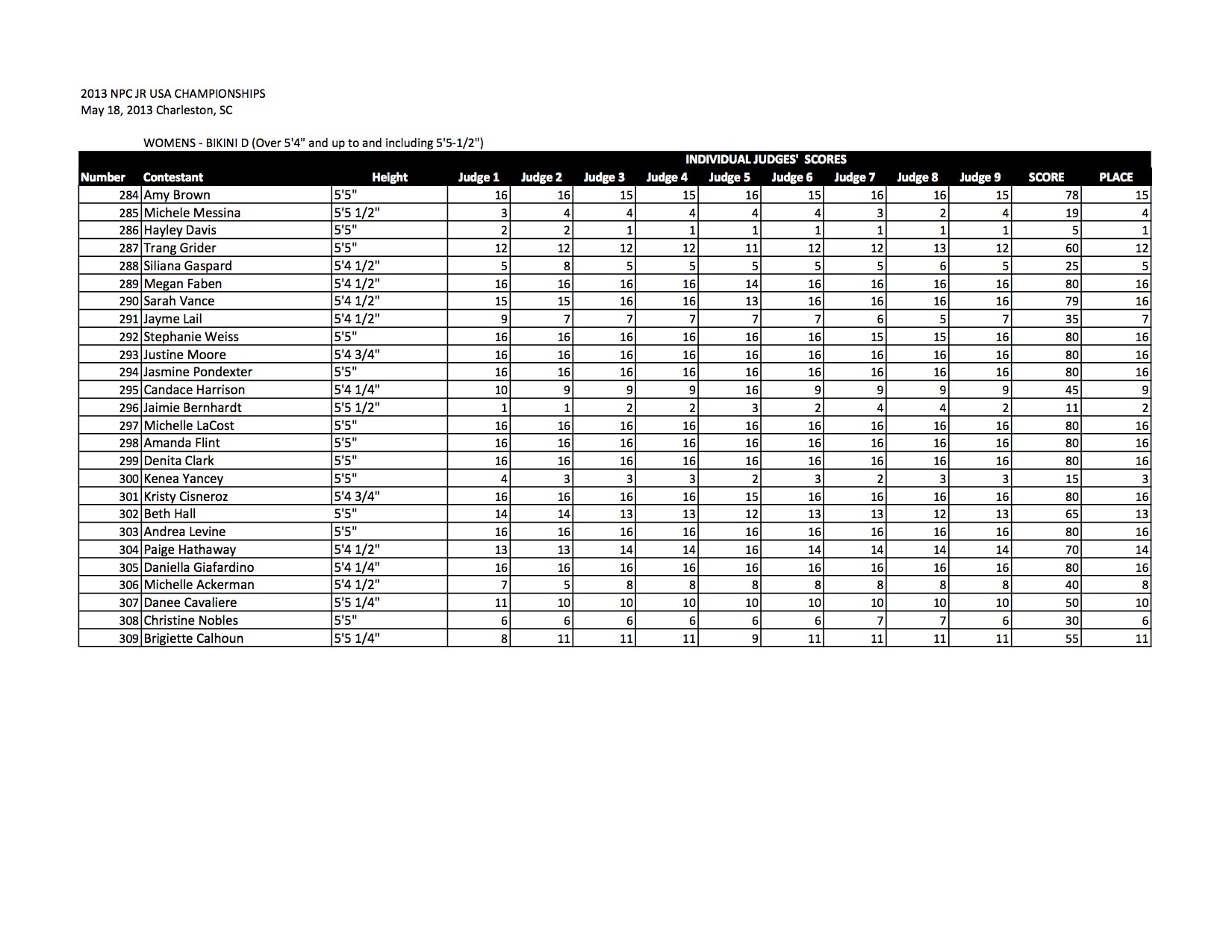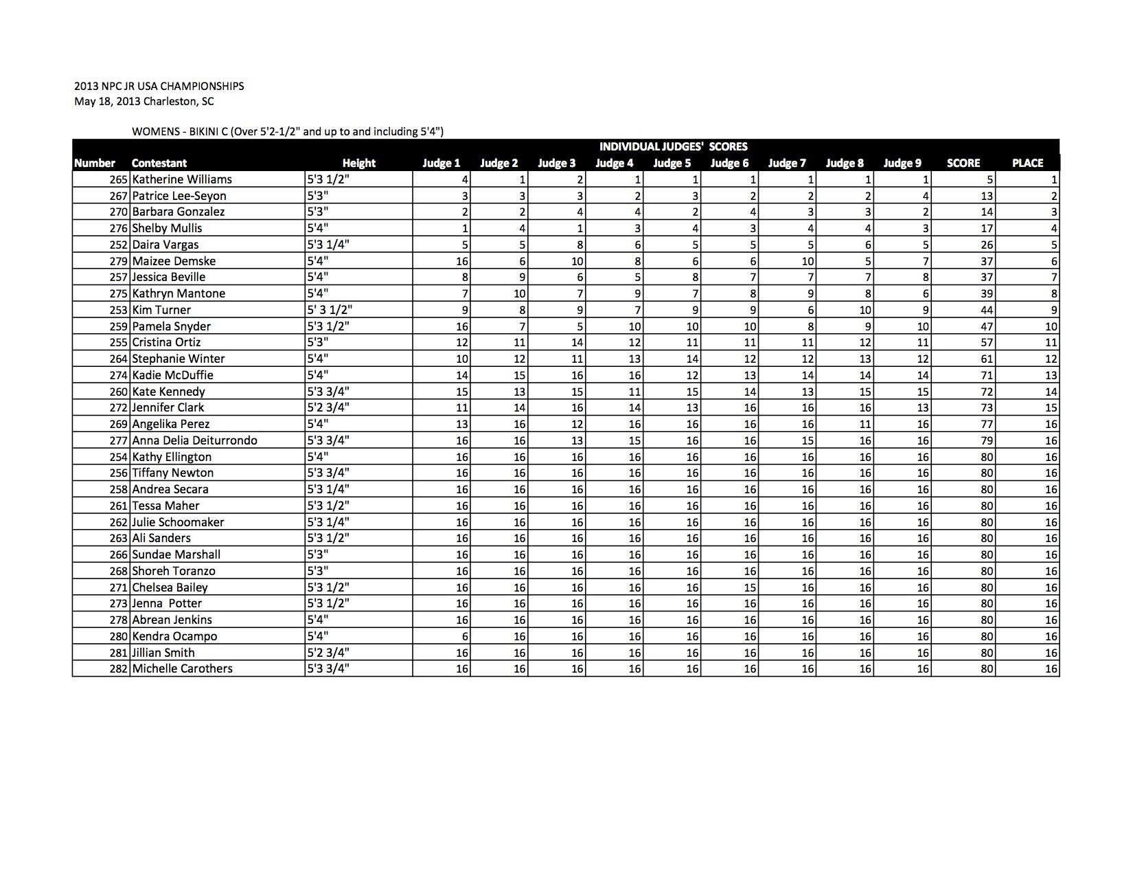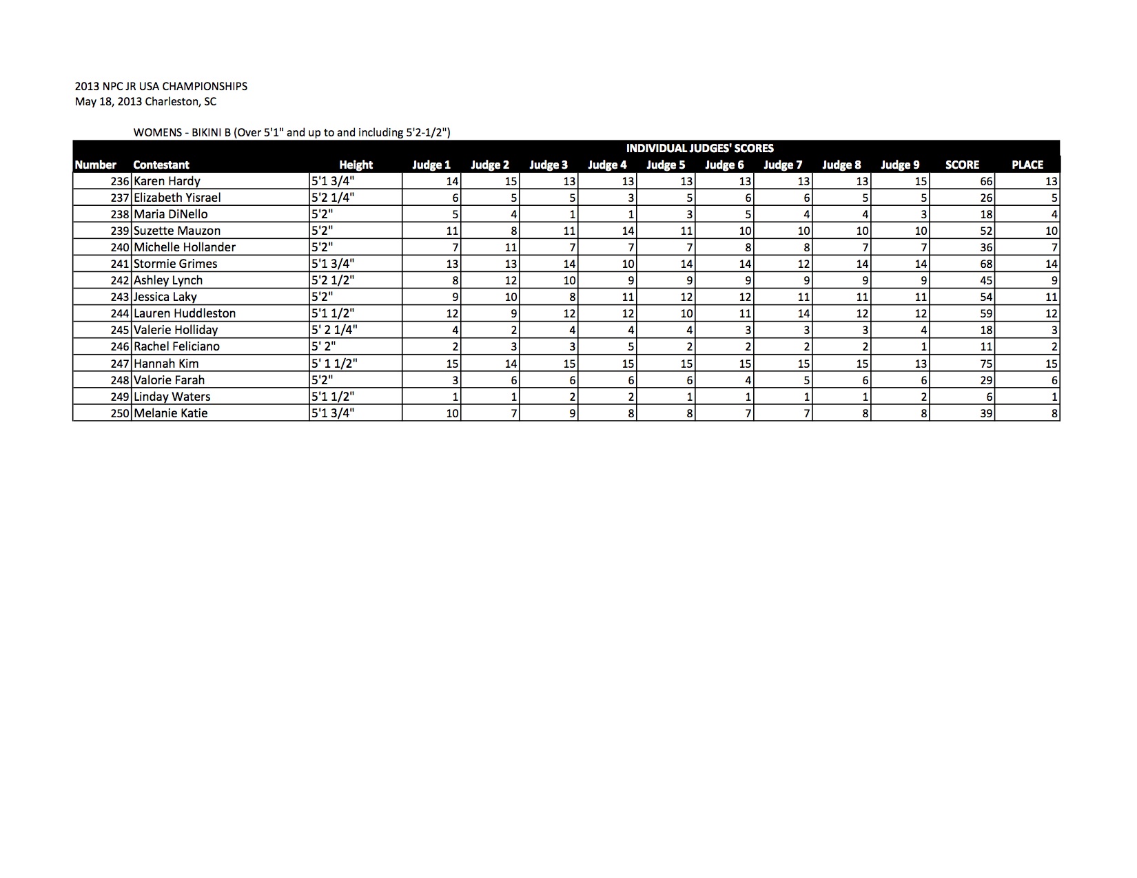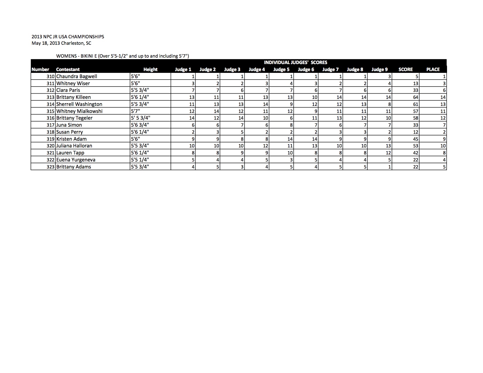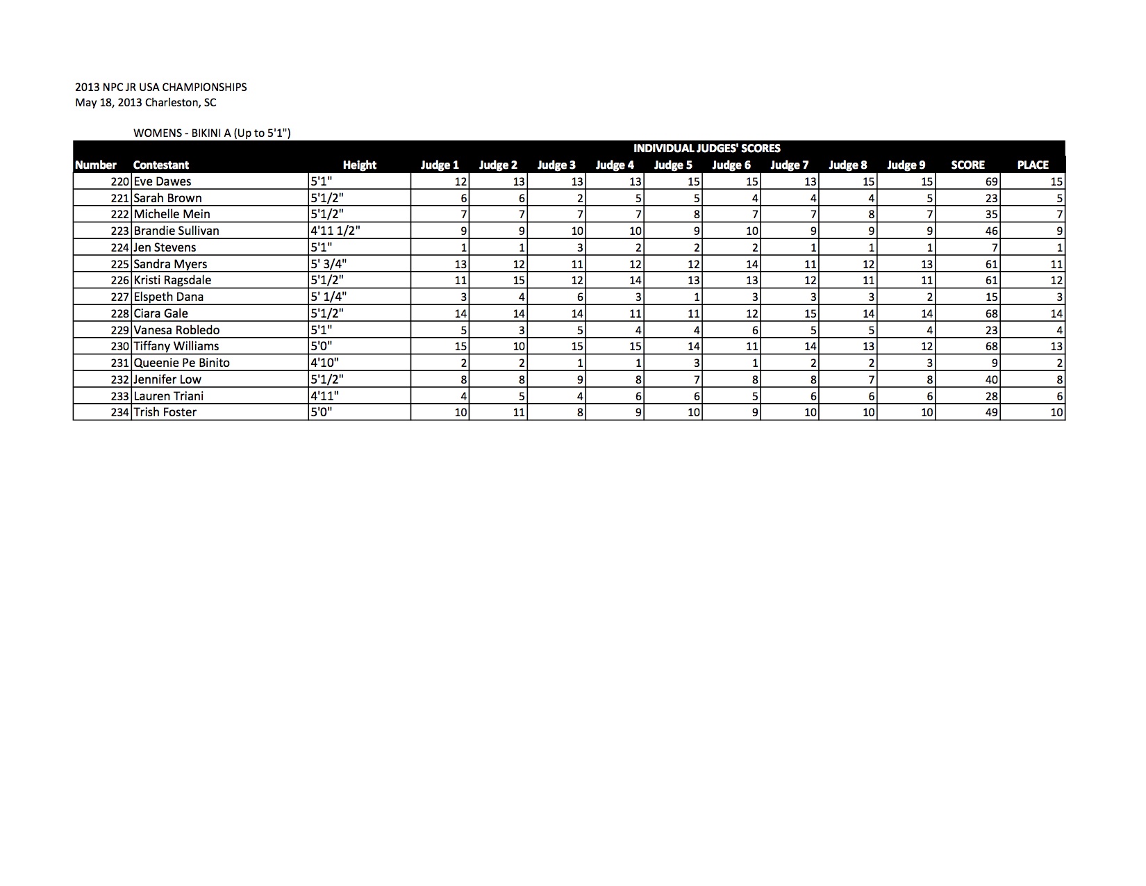 Check out all of the Bikini Official Score Sheets from the 2013 NPC Junior USA Championships!
