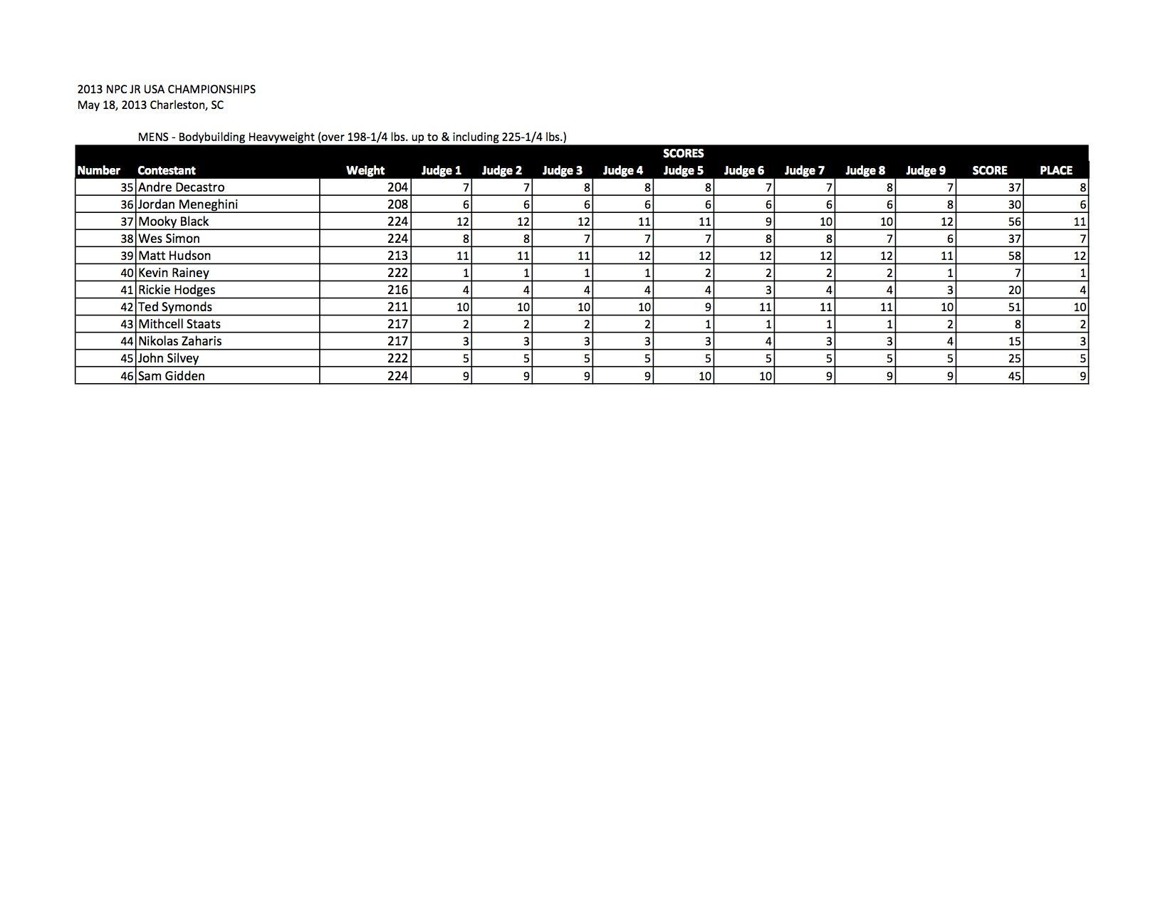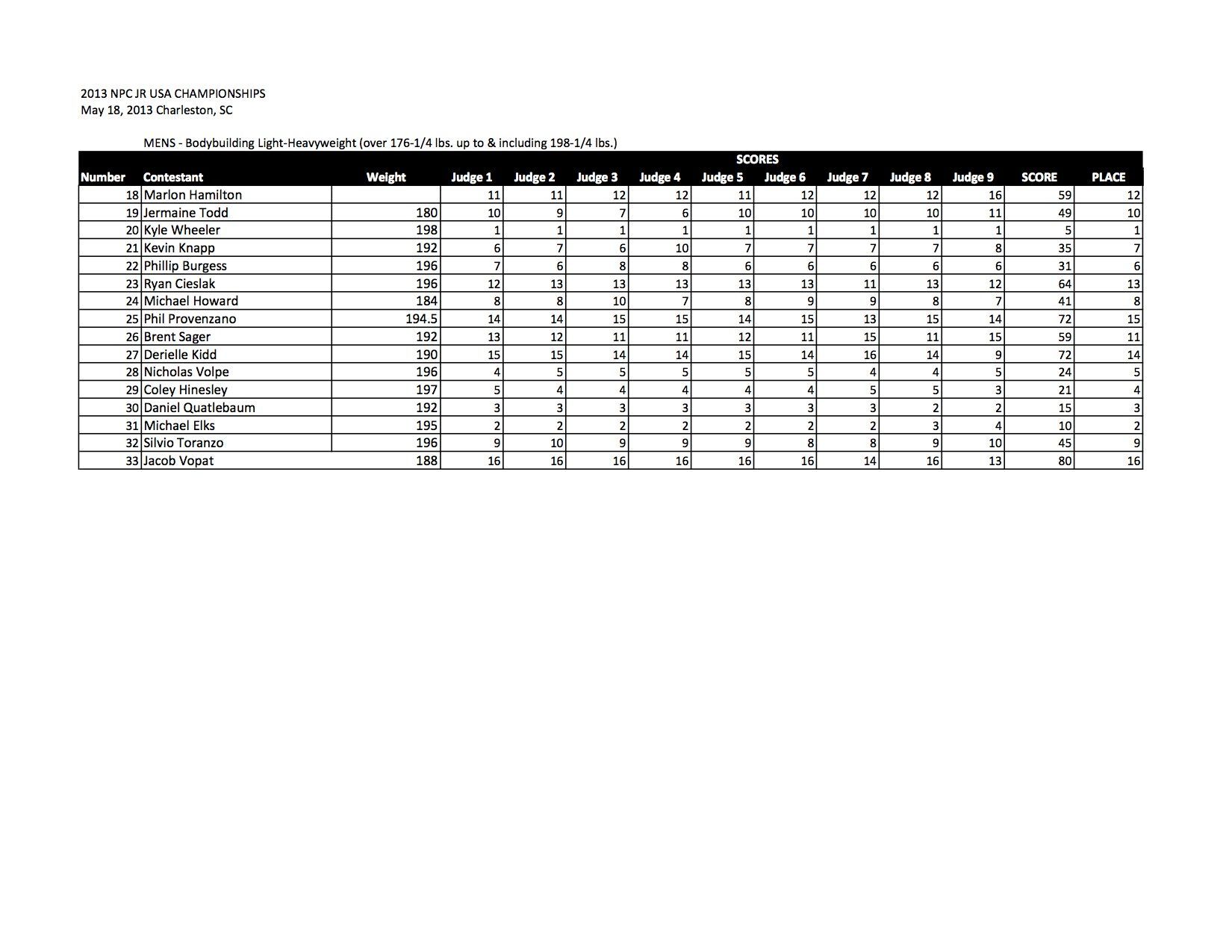 Check out all of the Men’s Bodybuilding Official Score Sheets from the 2013 NPC Junior USA Championships!