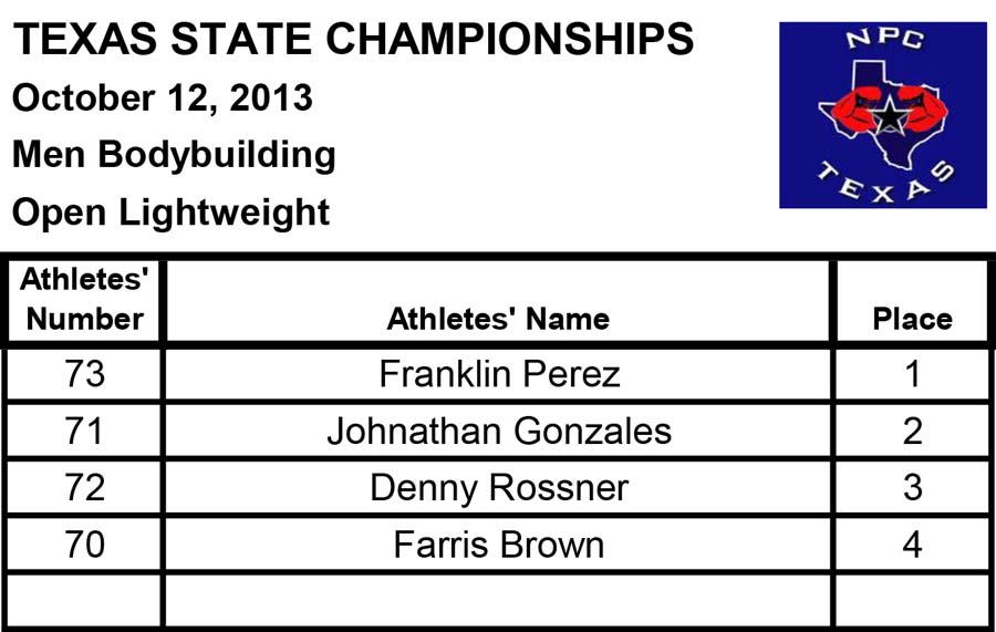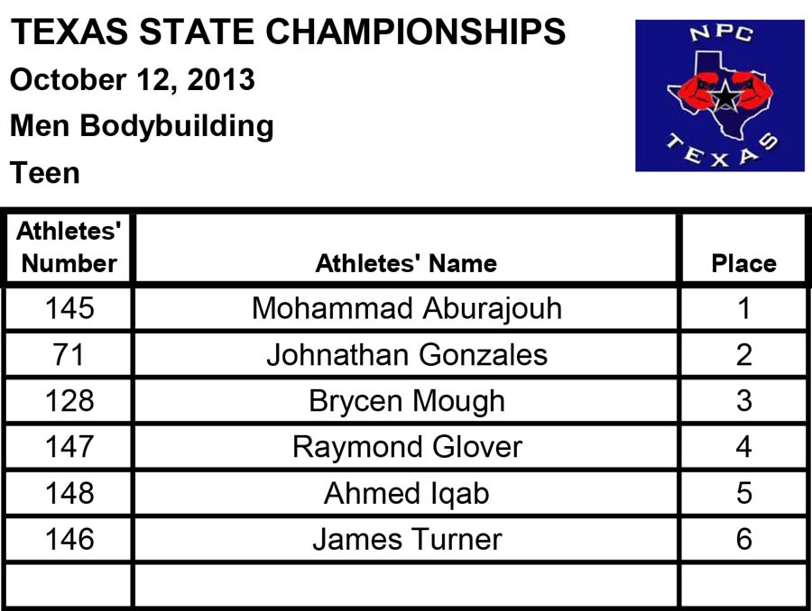 2013 NPC Texas State Championships Men’s Official Results October 13, 2013Articles, Features, NPC SHARE Facebook Twitter Pinterest Official Men’s Results from the 2013 NPC Texas State ChampionshipsBodybuildingMen’s Physiquemenphysamenphysbmenphyscmenphysdmenphysmastersmphysnoviceamphysnovicebmphysteen