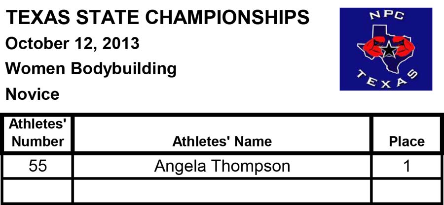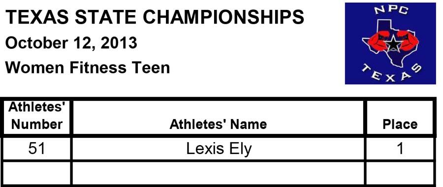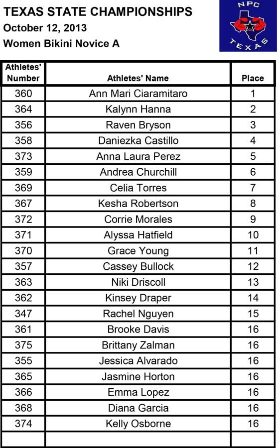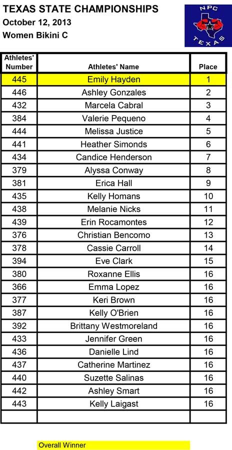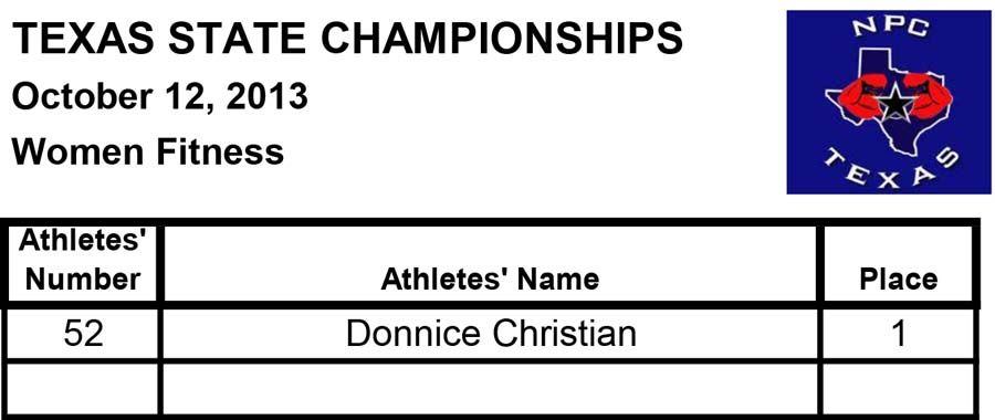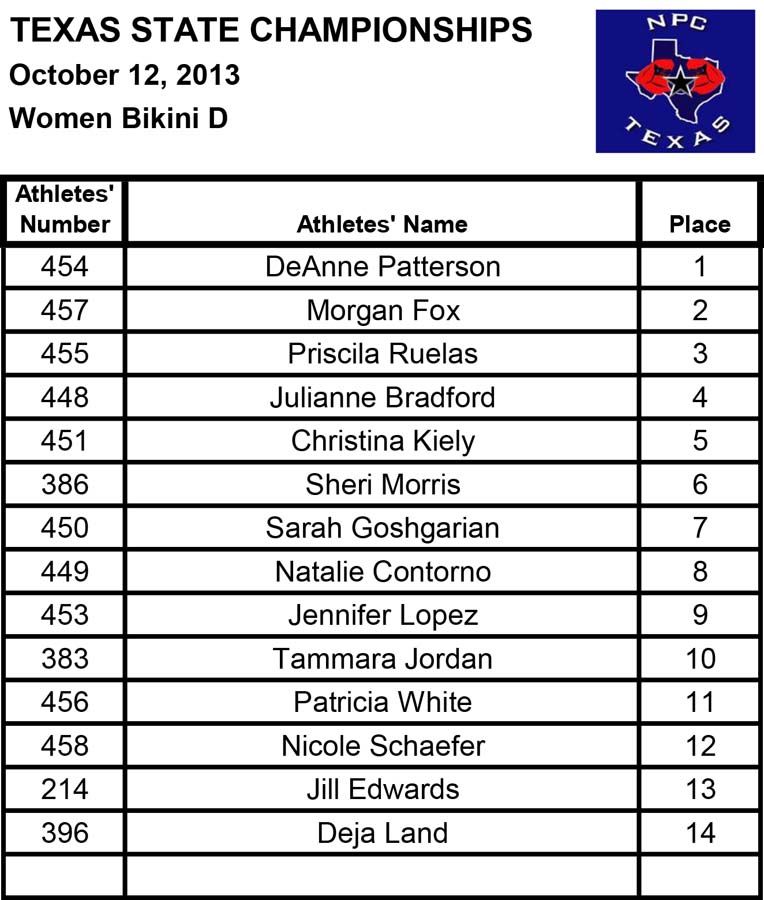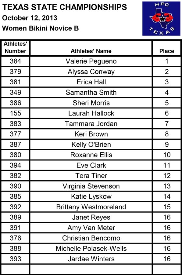 2013 NPC Texas State Championships Women’s Official Results October 13, 2013Articles, NPC SHARE Facebook Twitter Pinterest Official Women’s Results from the 2013 NPC Texas State ChampionshipsFitnessBikiniFigurefigureafigurebfiguremasters35figuremasters45figurenovicefigureteenWomen’s PhysiqueBodybuilding