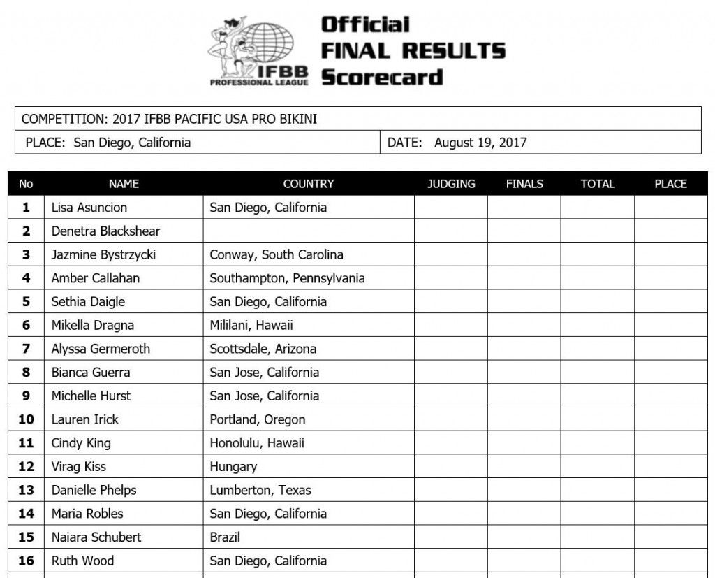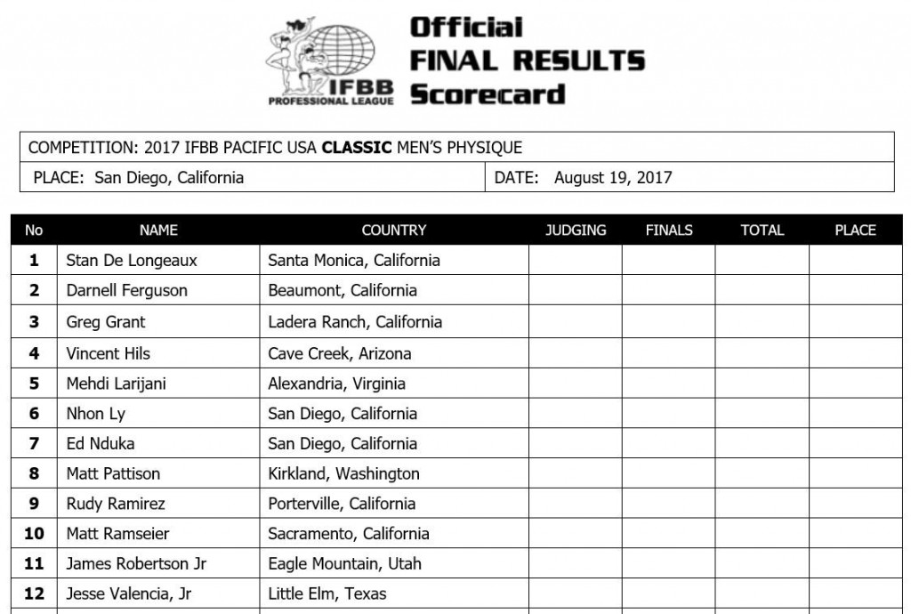 2017 IFBB Pacific USA Pro Final Competitor List: Pro Bikini & Pro Men’s Physique August 18, 2017August 18, 2017Features SHARE Facebook Twitter Pinterest 2017 IFBB Pacific USA Pro Final Competitor List