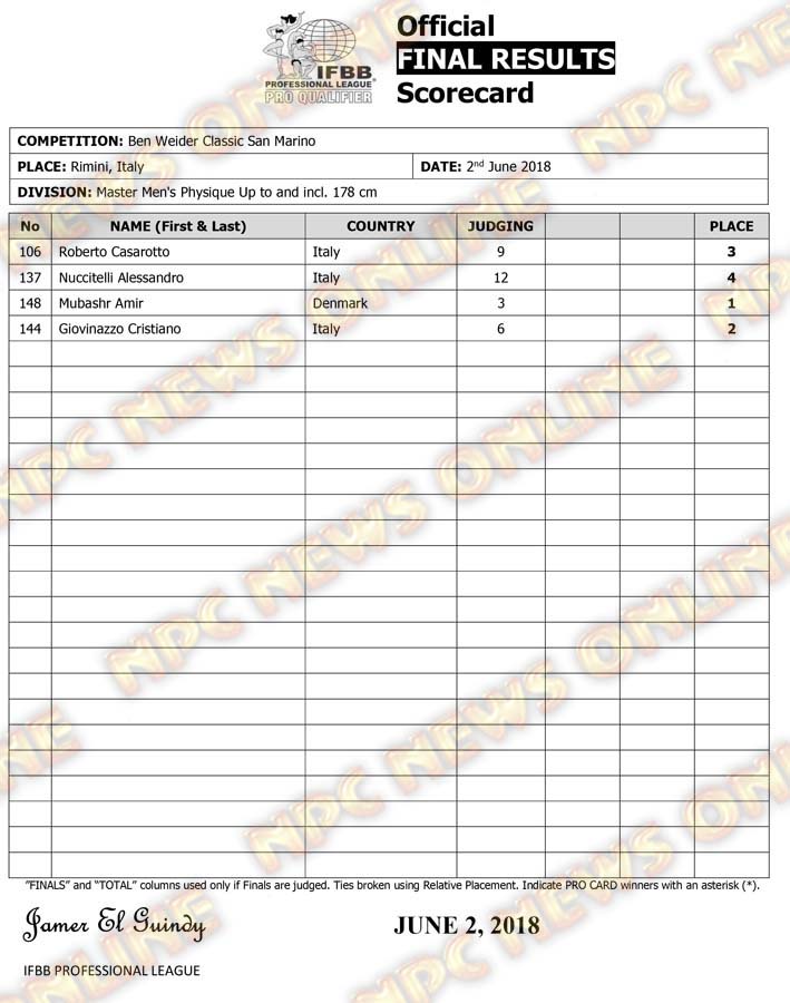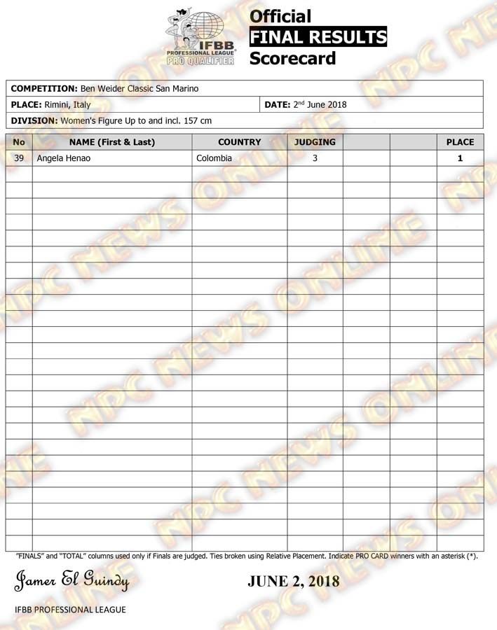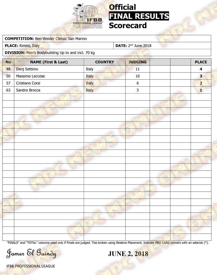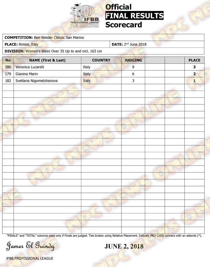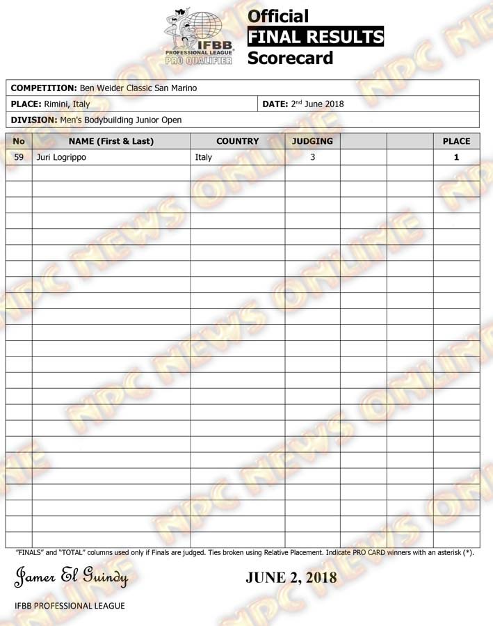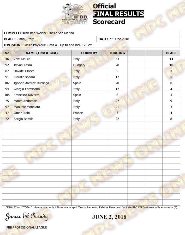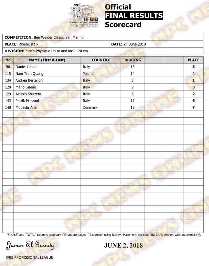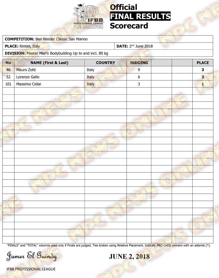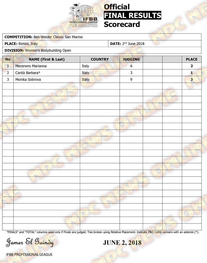 2018 Ben Weider Classic San Marino Official Score Cards June 3, 2018Articles, Contest Scorecards, Features, Reports SHARE Facebook Twitter Pinterest