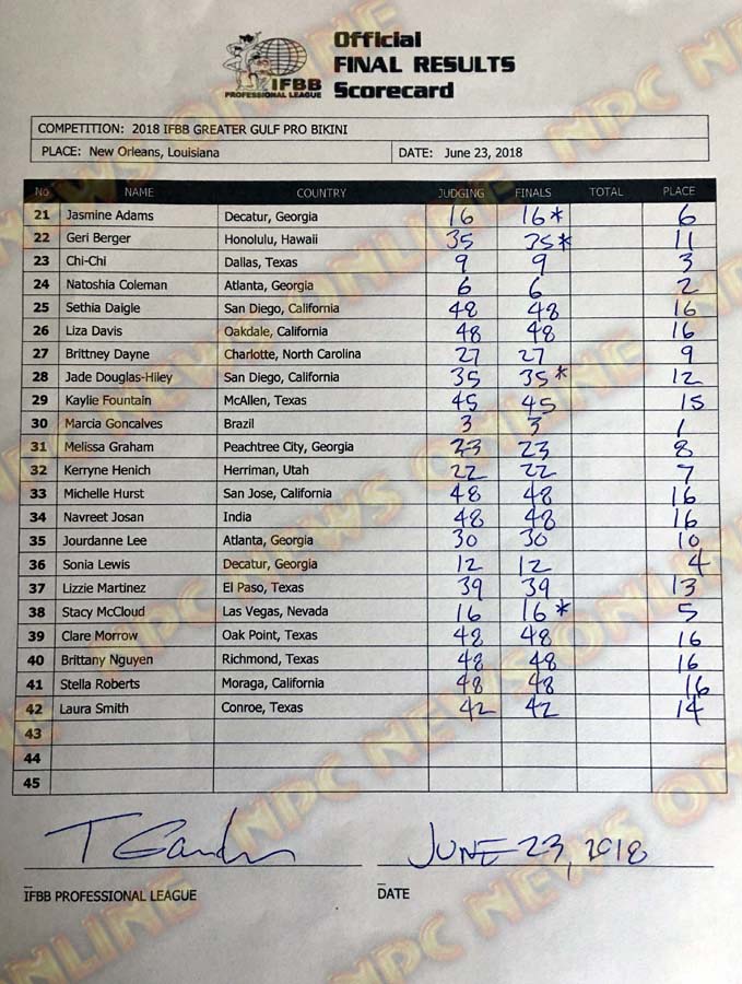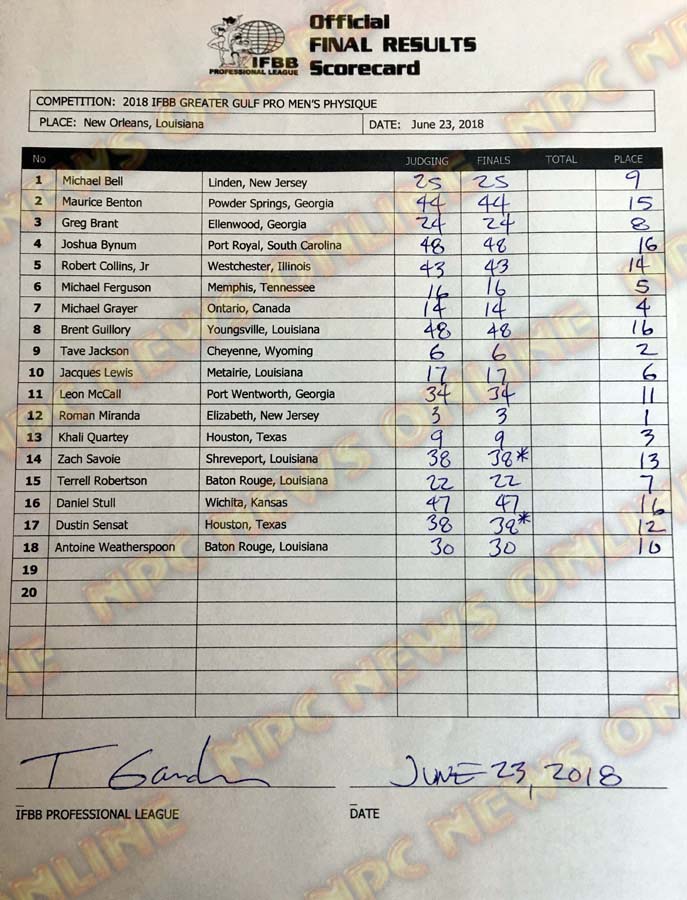 2018 IFBB Greater Gulf Pro Official Score Cards June 23, 2018Articles, Contest Scorecards, Features, Reports SHARE Facebook Twitter Pinterest