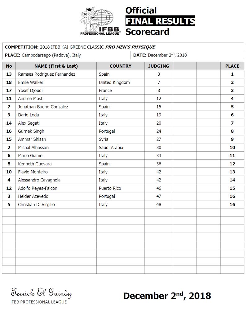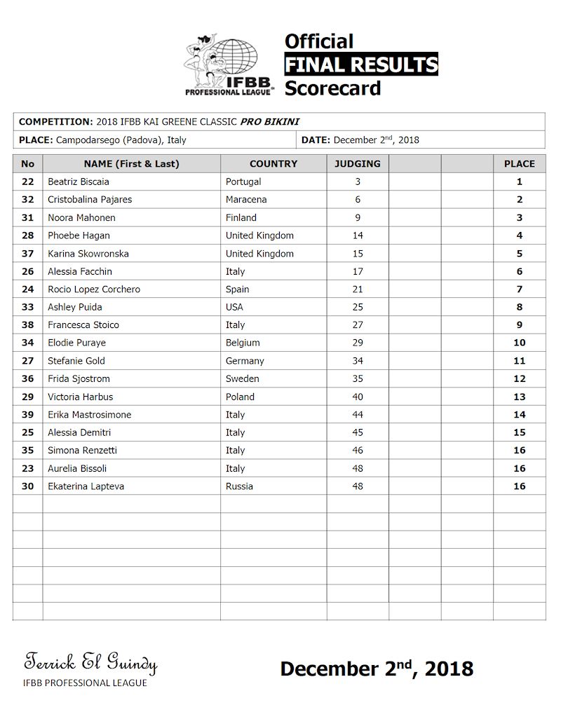 2018 IFBB Kai Greene Classic Contest Results December 3, 2018Articles, Features, Men's Physique, NPC Bikini, NPC/IFBB Scorecards SHARE Facebook Twitter Pinterest