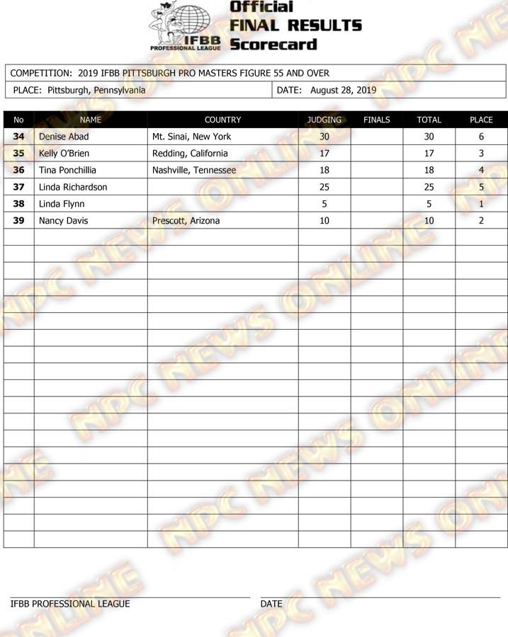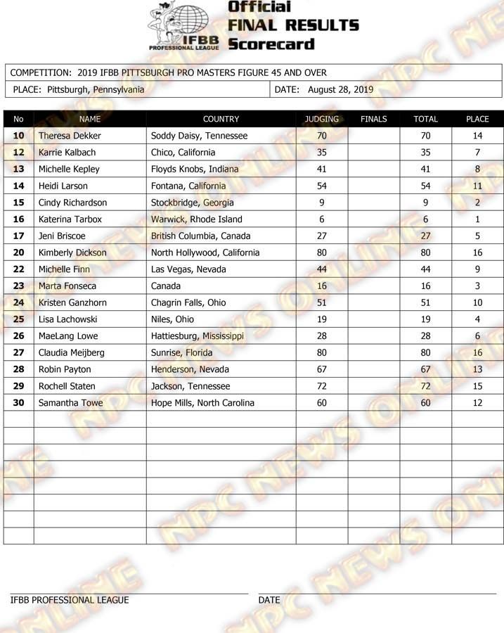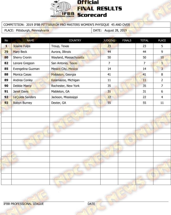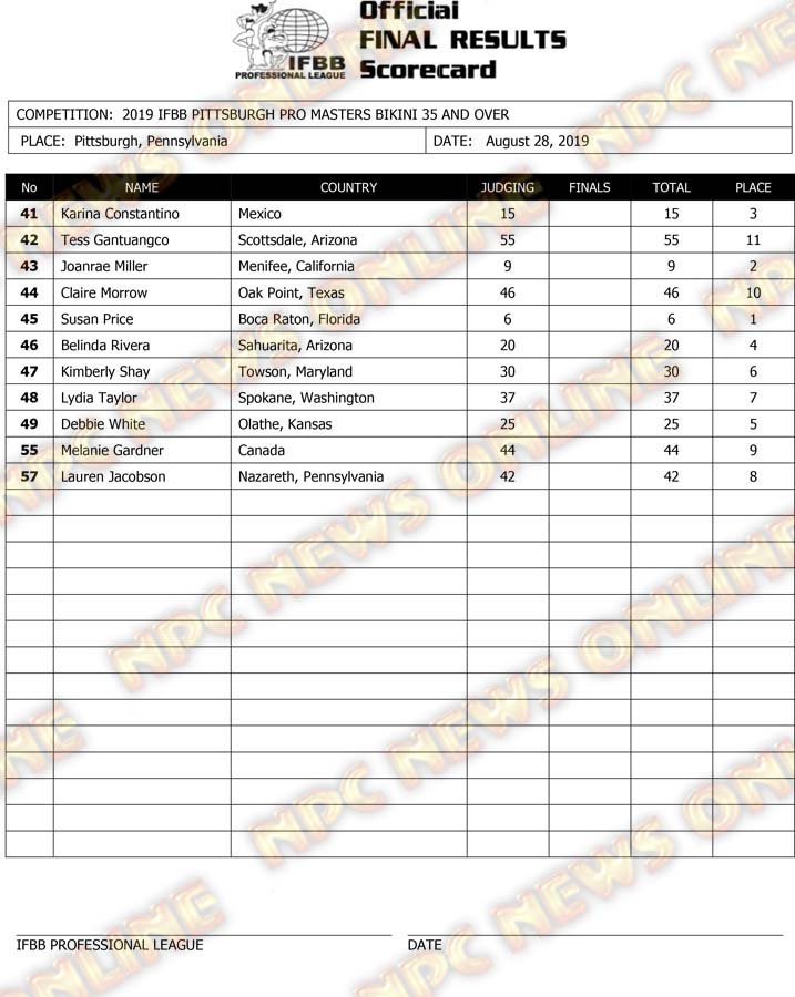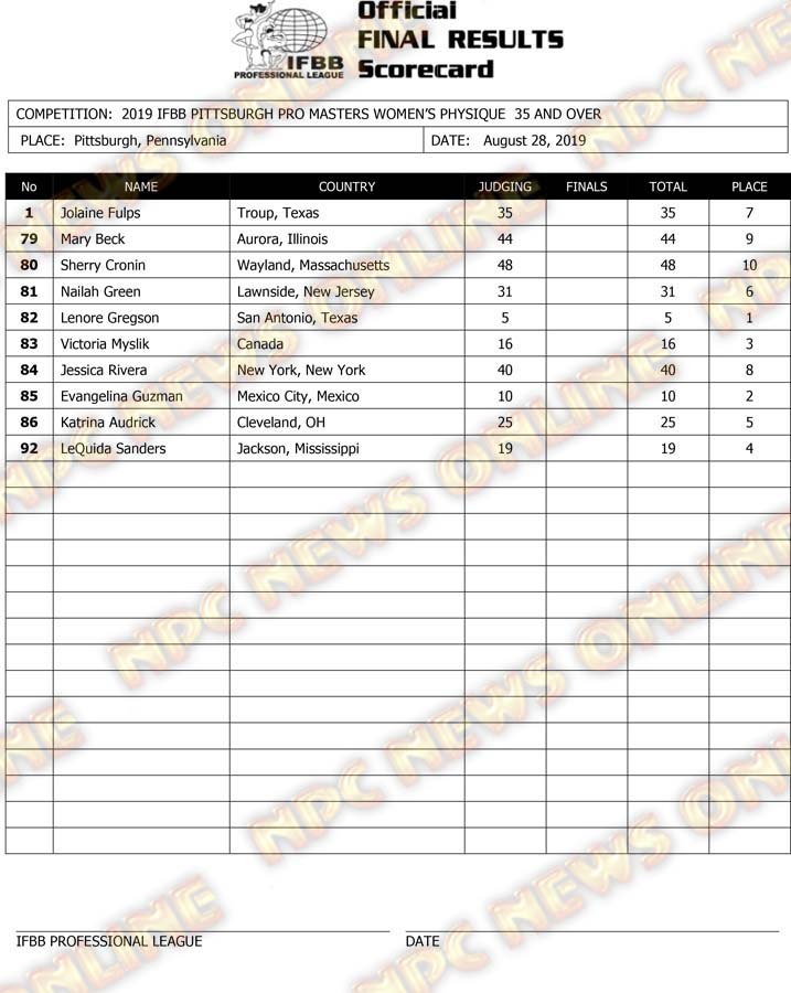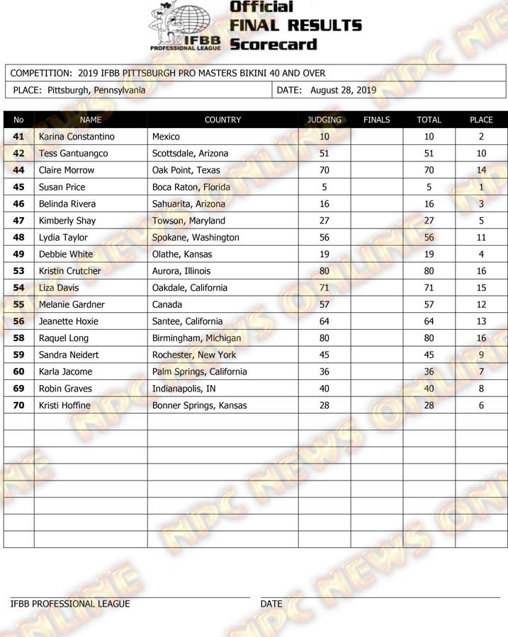 2019 IFBB Pittsburgh Pro Masters Championships Official Day One Score Cards August 28, 2019August 29, 2019Articles, Contest Scorecards, Features, NPC, Reports SHARE Facebook Twitter Pinterest