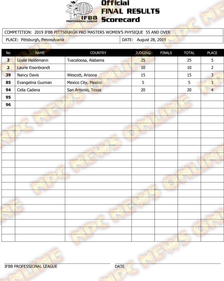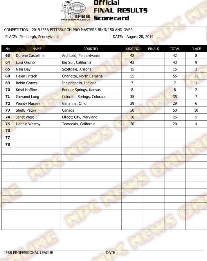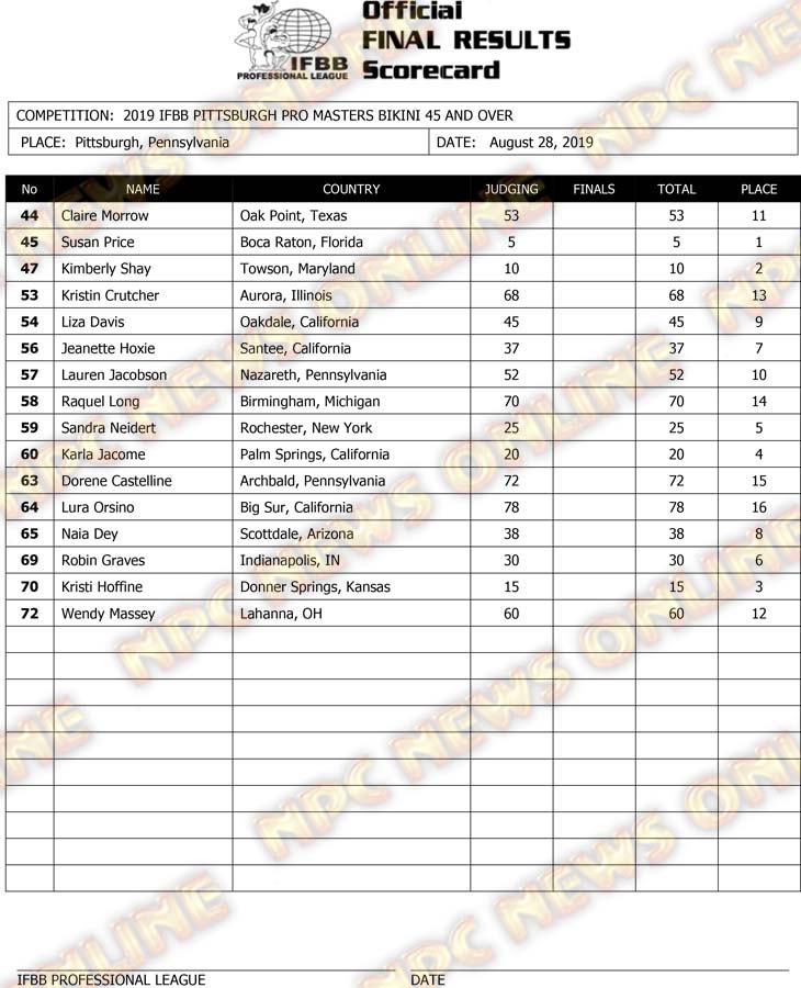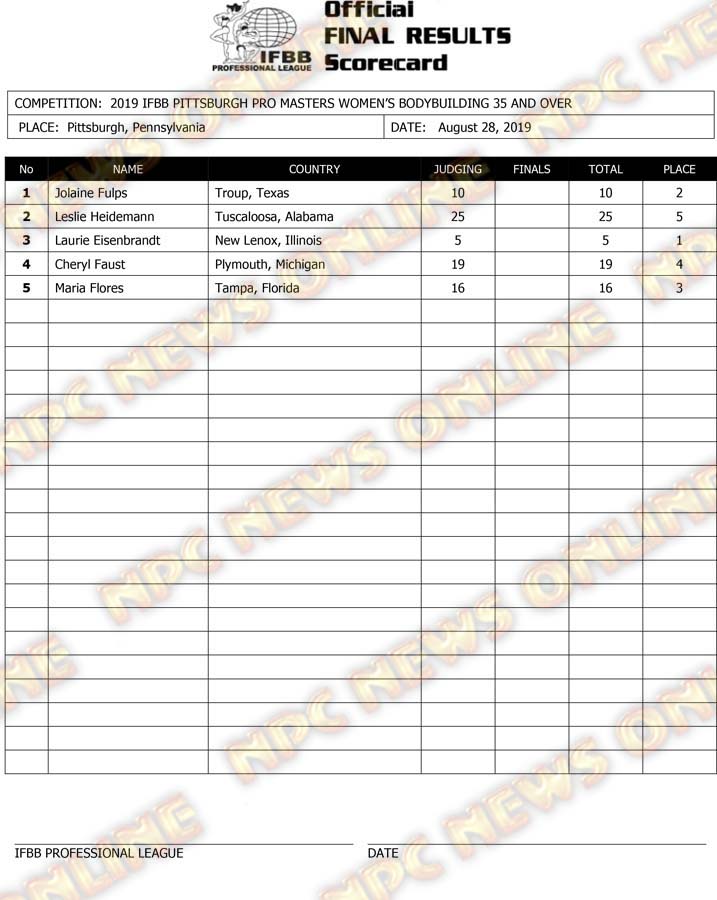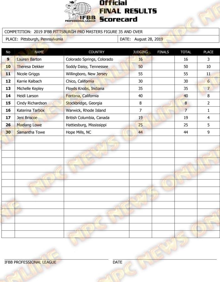 2019 IFBB Pittsburgh Pro Masters Championships Official Day One Score Cards August 28, 2019August 29, 2019Articles, Contest Scorecards, Features, NPC, Reports SHARE Facebook Twitter Pinterest