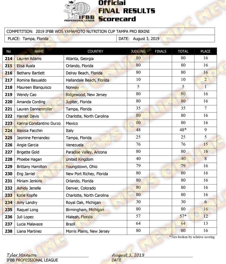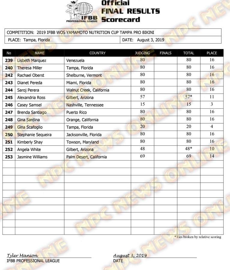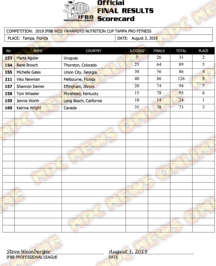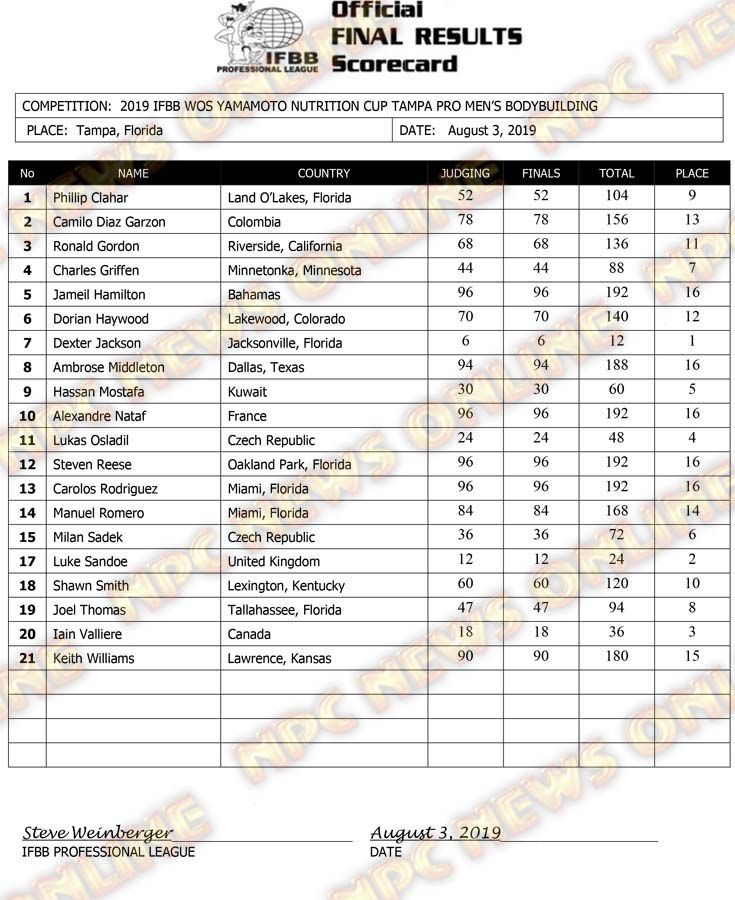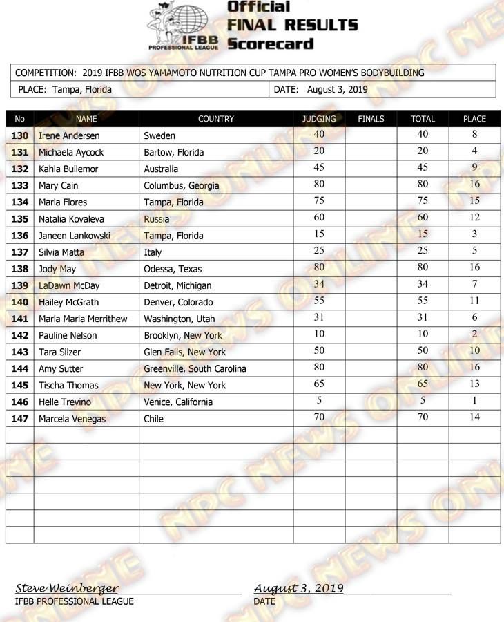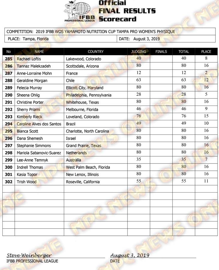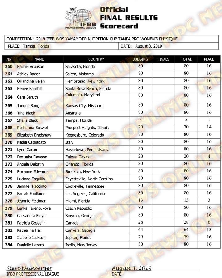 2019 IFBB Tampa Pro Day 2 Official Score Cards August 3, 2019August 3, 2019Articles, Contest Scorecards, Features, NPC, Reports SHARE Facebook Twitter Pinterest