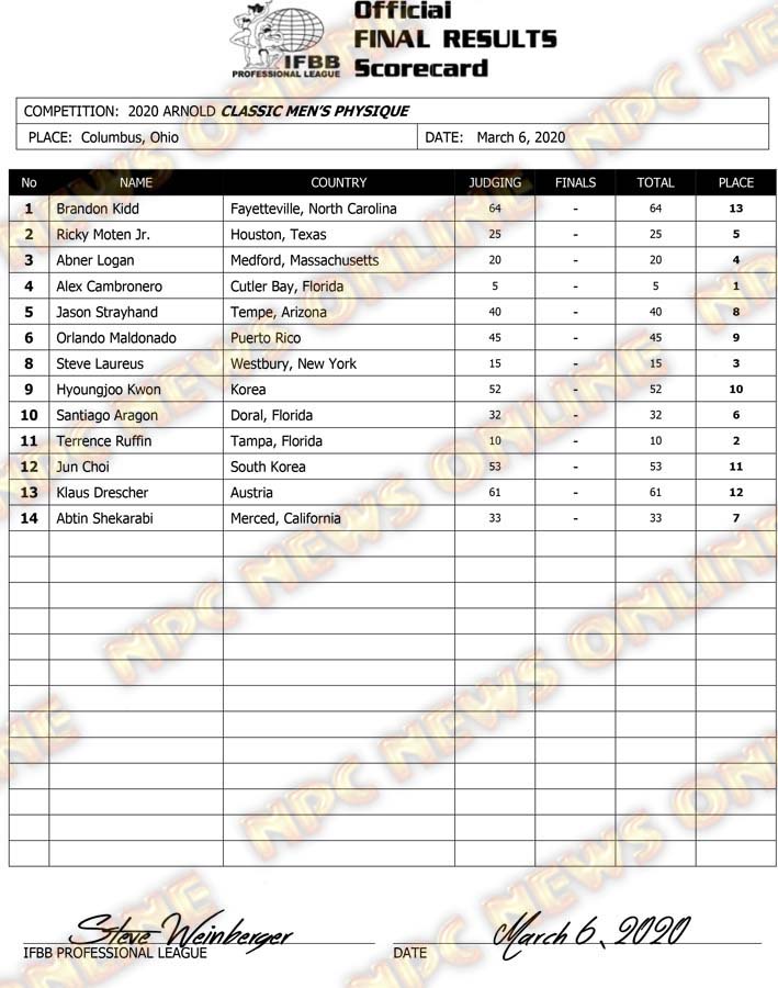 2020 Arnold Sports Festival Official Friday Score Cards March 6, 2020Articles, Contest Scorecards, Featured, Features, Reports SHARE Facebook Twitter Pinterest