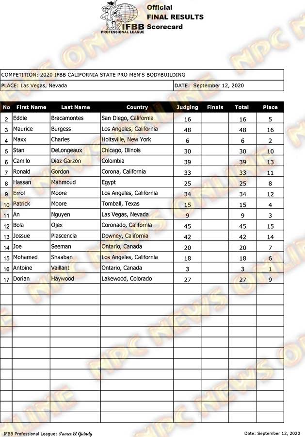 2020 IFBB California State Pro Official Score Cards September 12, 2020September 12, 2020Articles, Contest Scorecards, Featured, Features, Reports SHARE Facebook Twitter Pinterest
