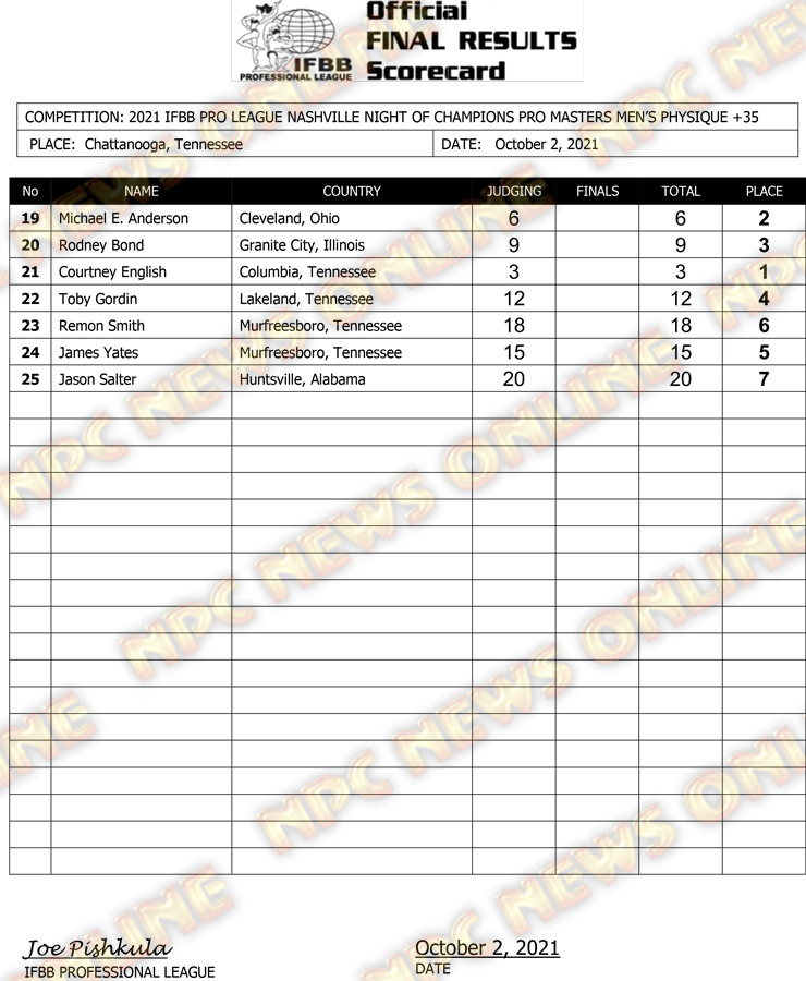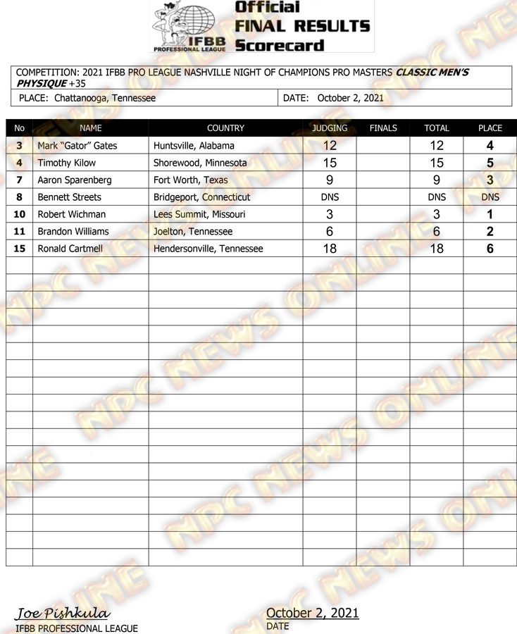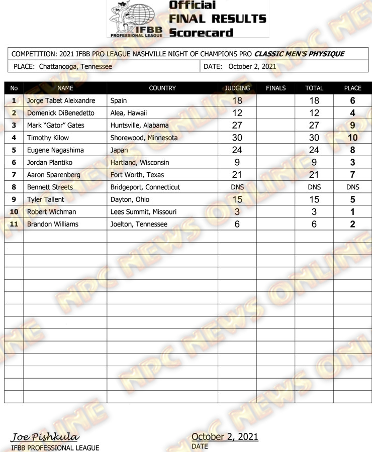2021 IFBB Nashville Night of Champions Pro Official Score Cards October 2, 2021Articles, Contest Scorecards, Featured, Features, Reports SHARE Facebook Twitter Pinterest