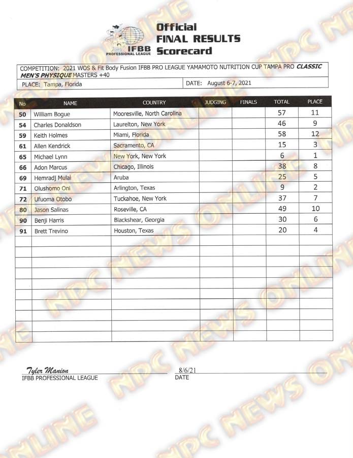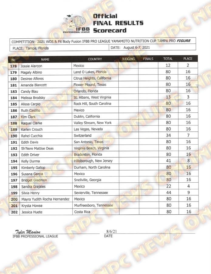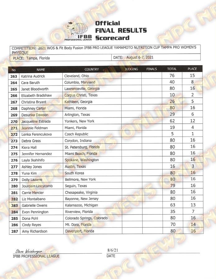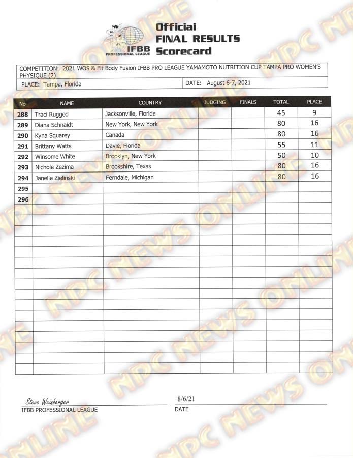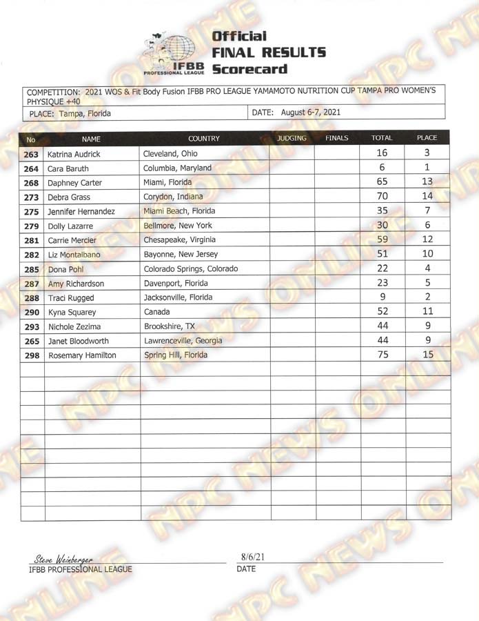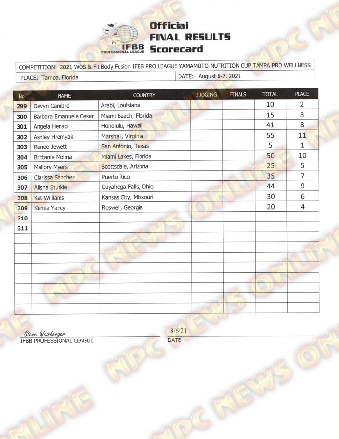 2021 IFBB Tampa Pro Official Day One Score Cards August 6, 2021August 6, 2021Articles, Contest Scorecards, Featured, Features, Reports SHARE Facebook Twitter Pinterest
