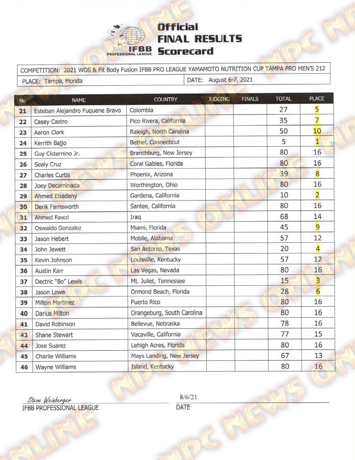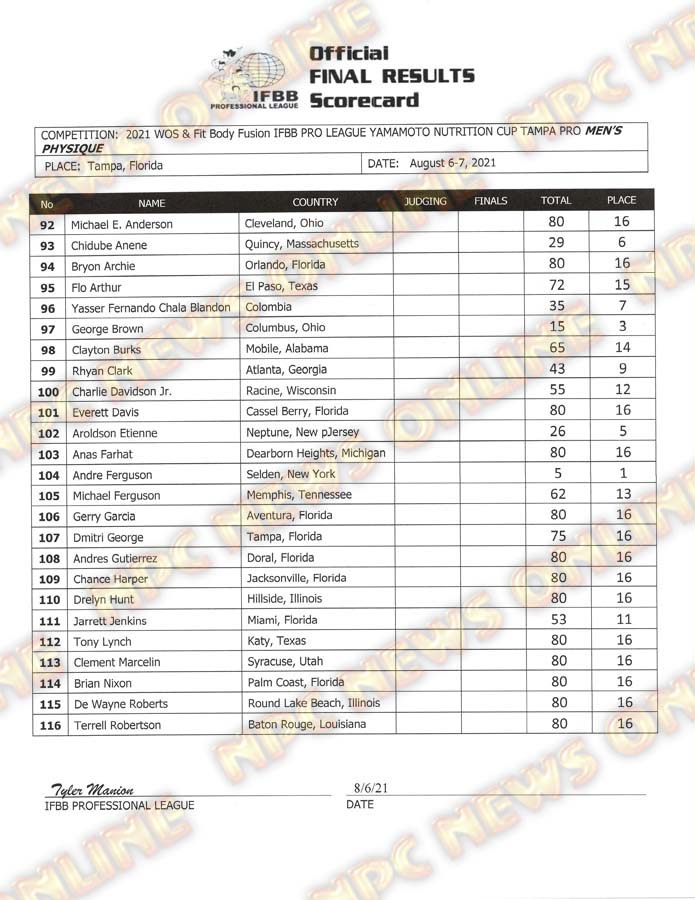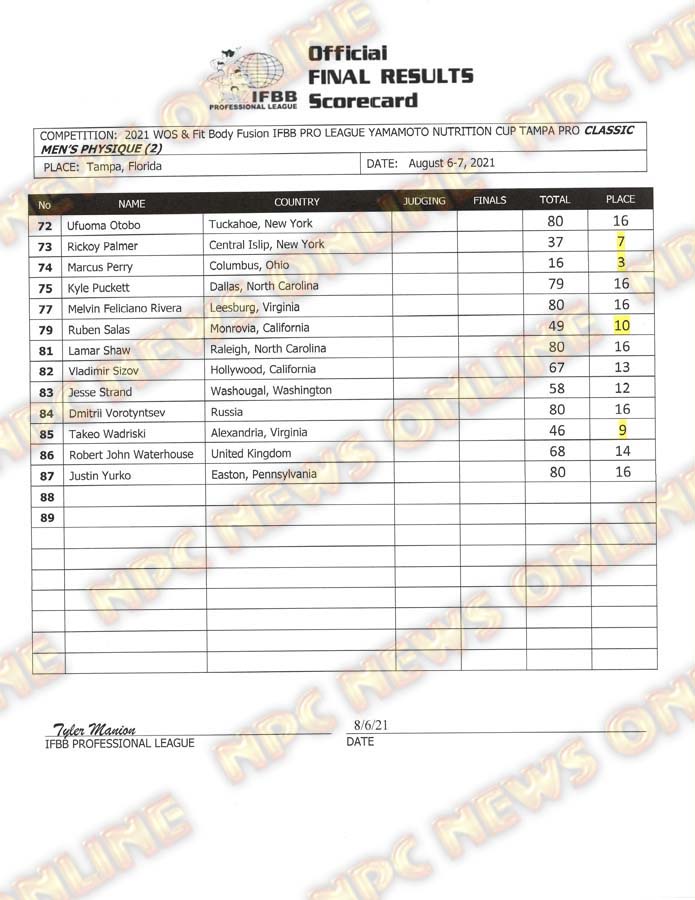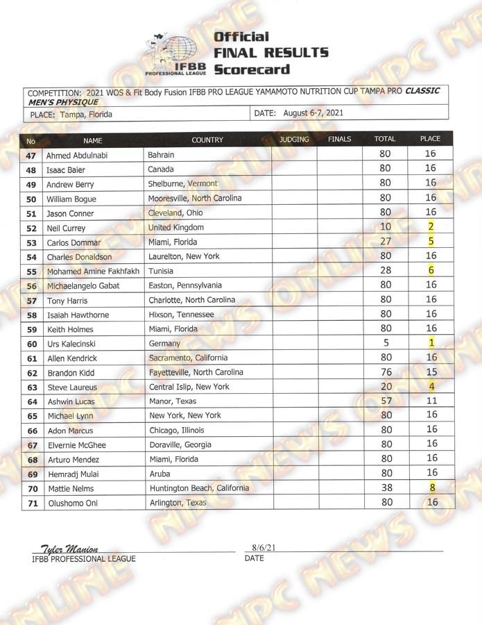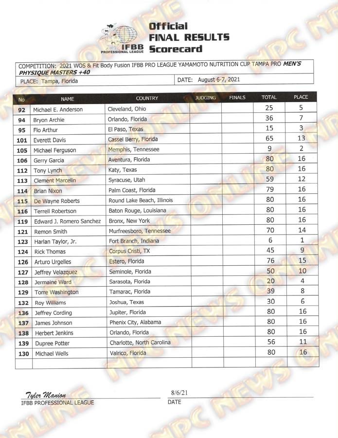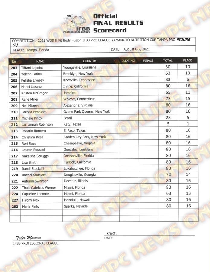 2021 IFBB Tampa Pro Official Day One Score Cards August 6, 2021August 6, 2021Articles, Contest Scorecards, Featured, Features, Reports SHARE Facebook Twitter Pinterest
