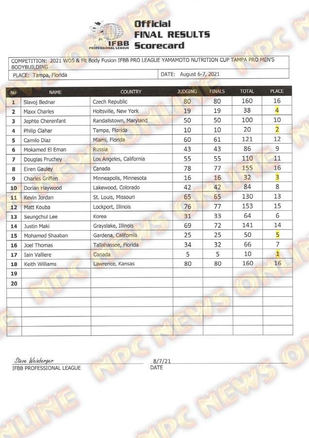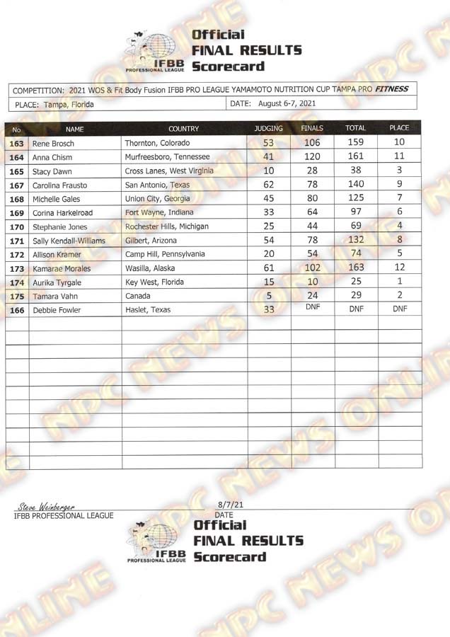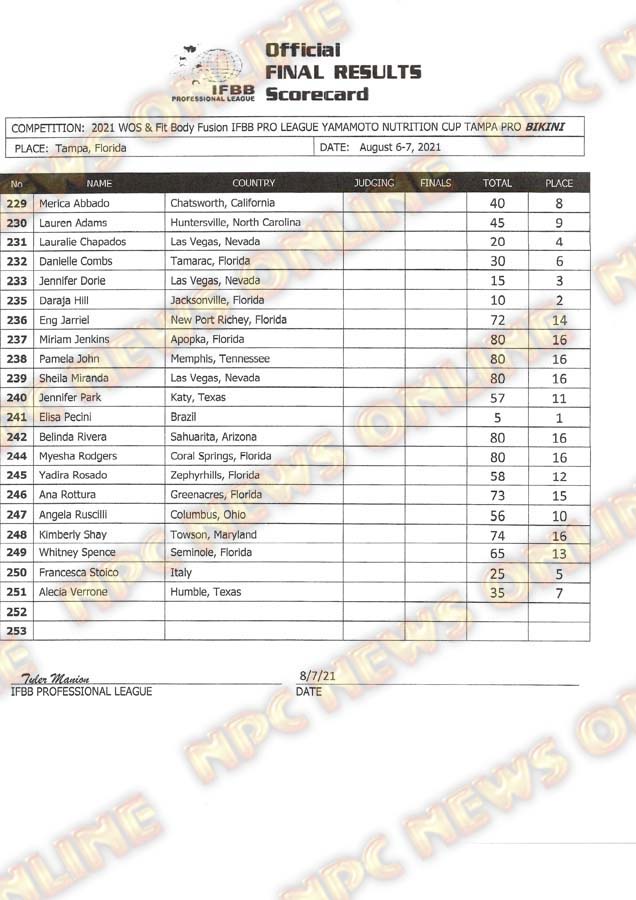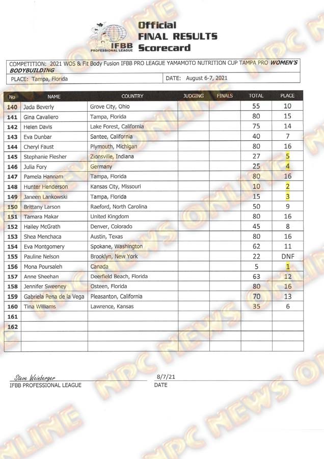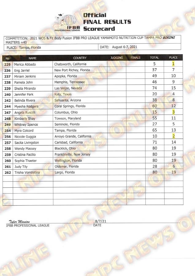 2021 IFBB Tampa Pro Official Day Two Score Cards August 7, 2021Articles, Contest Scorecards, Featured, Features, Reports SHARE Facebook Twitter Pinterest