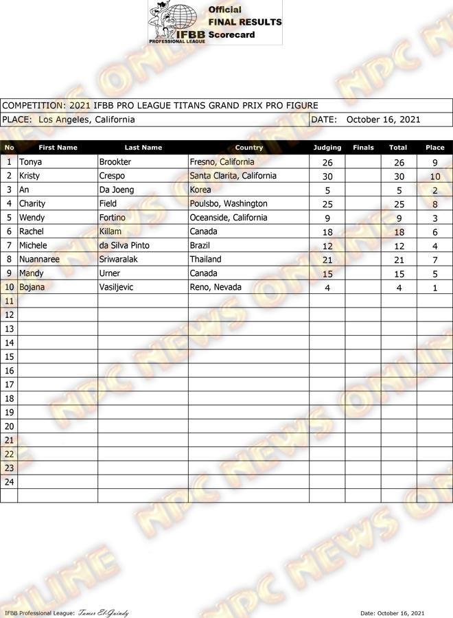 2021 IFBB Titans Grand Prix Pro Official Score Cards October 16, 2021October 16, 2021Articles, Contest Scorecards, Featured, Features, Reports SHARE Facebook Twitter Pinterest