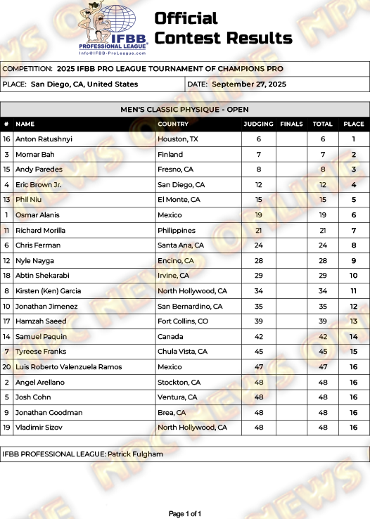 2025 IFBB Tournament of Champions Pro Official Score Cards September 27, 2025Articles, Classic Physique, Contest Scorecards, Featured, Features, Reports SHARE Facebook Twitter Pinterest