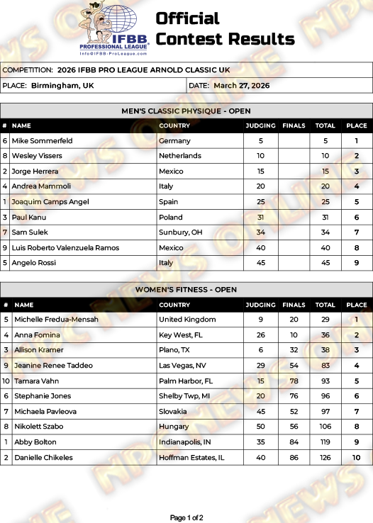 2026 IFBB Arnold Classic UK Official Friday Score Cards March 27, 2026Articles, Contest Scorecards, Featured, Features, Reports SHARE Facebook Twitter Pinterest