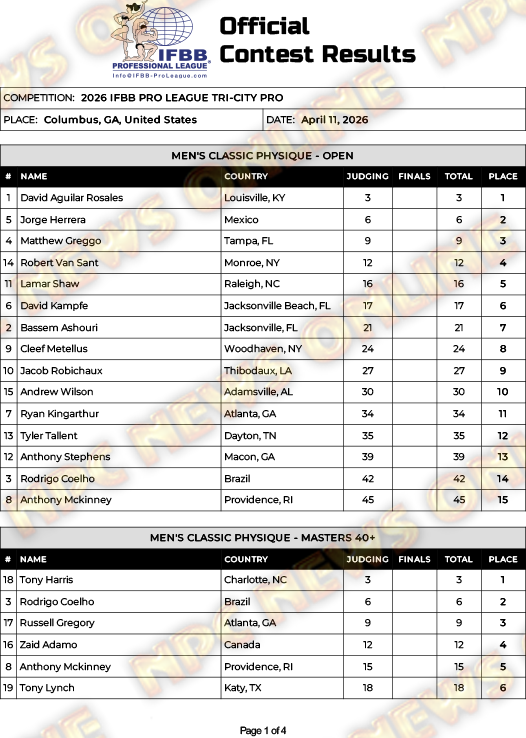 2026 IFBB Tri-City Classic Pro Official Score Cards April 11, 2026Articles, Contest Scorecards, Featured, Features, Reports SHARE Facebook Twitter Pinterest