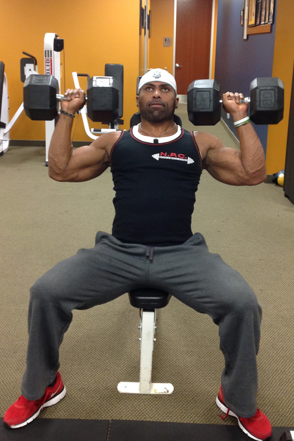 Antionne says: “I like to start out with the dumbbell shoulder press because it is a great stabilizing movement and it gets my shoulders warm for the rest of the workout. I usually start with dumbbells, but I’ll alternate with machine presses every other week or so.”