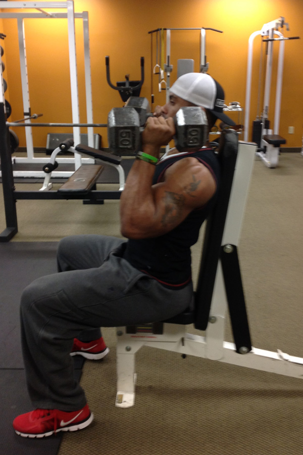 Antionne says: “I go with a lower rep range here to build a little more mass in that area. I feel more comfortable going heavier later in my training session because the blood is flowing and I am warm. I go down to 8 reps and pyramid up to finish the movement off by putting as much blood in the area at the end as possible.”