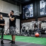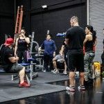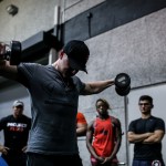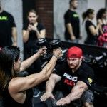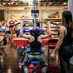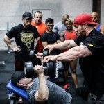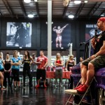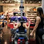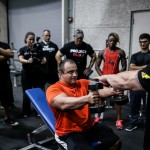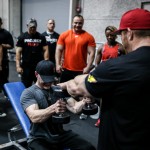12:00pm: Finally, Joe gathered all the campers for a group photo, but first called out one of the campers who complained about losing his pump while waiting. So the camper was called front and center for pushups –the camp joined Joe in counting over 40 pushups before Flex joined in with Ali and Comso for a photo. Flex then closed the gym down to the camp and took to the gym floor with Candice Keene and his team to train. Campers were encouraged to stay and watch the training session, while both Flex and Candice took time between sets to offer tips and answer any questions the camp had for them.