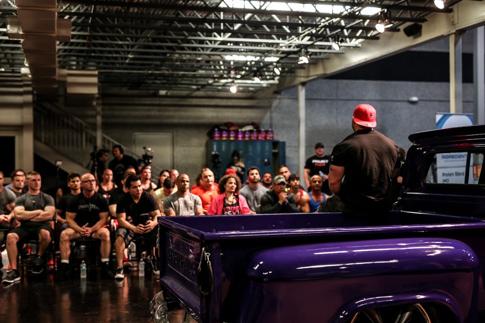 10am: Event emcee Joe Volgey, Flex’s Brand Manager, kicked off the day by going over the house rules before introducing the staff and the Champ. Flex took the mic and started by telling the story about how he was given the name “Flex” in Wales long before he was a bodybuilder. He then took the fans through the journey from his first show as a teen, meeting Neil Hill, moving to America, living in California in a virtual frat house of bodybuilders while training at Milos Sarcev Koloseum Gym, originally signing with Gaspari Nutrition, winning his first Olympia 212 Showdown title and ultimately signing with BSN. At that point, he opened up the discussion to the fans for a Q&A session.
